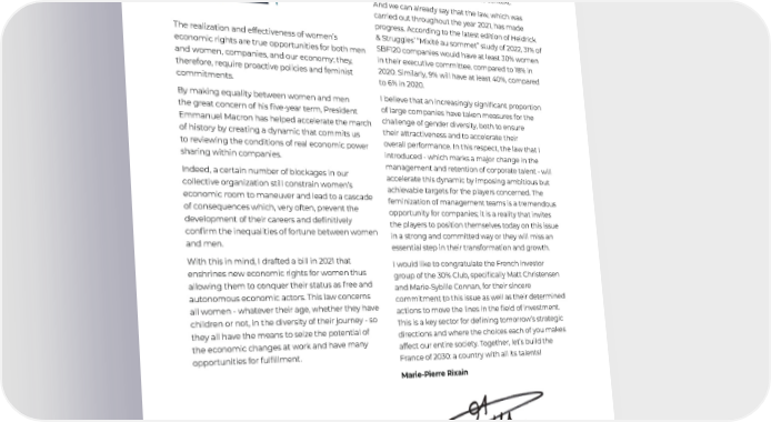 2022 Annual Report 5 30% Club France Investor Group The realization and effectiveness of women’s economic rights are true opportunities for both men and women, companies, and our economy; they, therefore, require proactive policies and feminist commitments. By making equality between women and men the great concern of his five-year term, President Emmanuel Macron has helped accelerate the march of history by creating a dynamic that commits us to reviewing the conditions of real economic power sharing within companies. Indeed, a certain number of blockages in our collective organization still constrain women’s economic room to maneuver and lead to a cascade of consequences which, very often, prevent the development of their careers and definitively confirm the inequalities of fortune between women and men. With this in mind, I drafted a bill in 2021 that enshrines new economic rights for women thus allowing them to conquer their status as f ree and autonomous economic actors. This law concerns all women - whatever their age, whether they have children or not, in the diversity of their journey - so they all have the means to seize the potential of the economic changes at work and have many opportunities for fulfillment. The number of requests I receive proves that this issue is on the table for all companies now more than ever and that is something I am delighted about! Finally, our country is thinking about how to make half of the working population a source of value creation, wealth, and jobs. This reflection is especially necessary for the current economic context. And we can already say that the law, which was carried out throughout the year 2021, has made progress. According to the latest edition of Heidrick & Struggles’ “Mixité au sommet” study of 2022, 31% of SBF120 companies would have at least 30% women in their executive committee, compared to 18% in 2020. Similarly, 9% will have at least 40%, compared to 6% in 2020. I believe that an increasingly significant proportion of large companies have taken measures for the challenge of gender diversity, both to ensure their attractiveness and to accelerate their overall performance. In this respect, the law that I introduced - which marks a major change in the management and retention of corporate talent - will accelerate this dynamic by imposing ambitious but achievable targets for the players concerned. The feminization of management teams is a tremendous opportunity for companies; it is a reality that invites the players to position themselves today on this issue in a strong and committed way or they will miss an essential step in their transformation and growth. I would like to congratulate the French investor group of the 30% Club, specifically Matt Christensen and Marie-Sybille Connan, for their sincere commitment to this issue as well as their determined actions to move the lines in the field of investment. This is a key sector for defining tomorrow’s strategic directions and where the choices each of you makes affect our entire society. Together, let’s build the France of 2030: a country with all its talents! Marie-Pierre Rixain Marie-Pierre Rixain , Member of the French Parliament