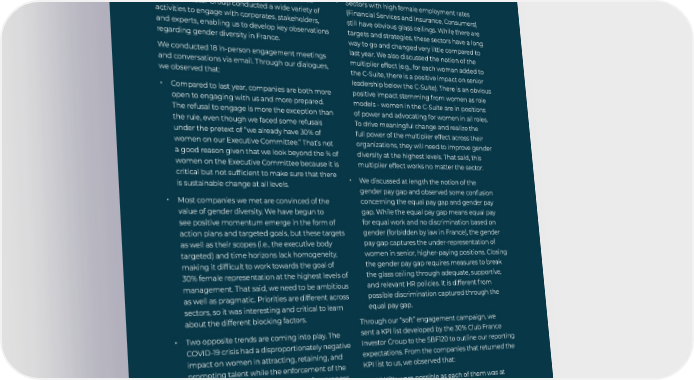 In its second year of the campaign, the 30% Club France Investor Group conducted a wide variety of activities to engage with corporates, stakeholders, and experts, enabling us to develop key observations regarding gender diversity in France. We conducted 18 in-person engagement meetings and conversations via email. Through our dialogues, we observed that: • Compared to last year, companies are both more open to engaging with us and more prepared. The refusal to engage is more the exception than the rule, even though we faced some refusals under the pretext of “we already have 30% of women on our Executive Committee.” That’s not a good reason given that we look beyond the % of women on the Executive Committee because it is critical but not sufficient to make sure that there is sustainable change at all levels. • Most companies we met are convinced of the value of gender diversity. We have begun to see positive momentum emerge in the form of action plans and targeted goals, but these targets as well as their scopes (i.e., the executive body targeted) and time horizons lack homogeneity, making it difficult to work towards the goal of 30% female representation at the highest levels of management. That said, we need to be ambitious as well as pragmatic. Priorities are different across sectors, so it was interesting and critical to learn about the different blocking factors. • Two opposite trends are coming into play. The COVID-19 crisis had a disproportionately negative impact on women in attracting, retaining, and promoting talent while the enforcement of the Rixain Law acted as an accelerator of awareness for the importance of gender diversity. The issue is more acute in some sectors, particularly industrial and STEM activities, making the competition for attracting female talent more intense. The generalization of telework may accentuate the recruitment problem for those companies where this will not be possible due to the nature of the jobs. We will see in our dialogues how companies can remain attractive to women. Executive Summary • Sectors with high female employment rates (Financial Services and Insurance, Consumers) still have obvious glass ceilings. While there are targets and strategies, these sectors have a long way to go and changed very little compared to last year. We also discussed the notion of the multiplier effect (e.g., for each woman added to the C-Suite, there is a positive impact on senior leadership below the C-Suite). There is an obvious positive impact stemming f rom women as role models - women in the C-Suite are in positions of power and advocating for women in all roles. To drive meaningful change and realize the full power of the multiplier effect across their organizations, they will need to improve gender diversity at the highest levels. That said, this multiplier effect works no matter the sector. • We discussed at length the notion of the gender pay gap and observed some confusion concerning the equal pay gap and gender pay gap. While the equal pay gap means equal pay for equal work and no discrimination based on gender (forbidden by law in France), the gender pay gap captures the under-representation of women in senior, higher-paying positions. Closing the gender pay gap requires measures to break the glass ceiling through adequate, supportive, and relevant HR policies. It is different f rom possible discrimination captured through the equal pay gap. Through our “soft” engagement campaign, we sent a KPI list developed by the 30% Club France Investor Group to the SBF120 to outline our reporting expectations. From the companies that returned the KPI list to us, we observed that: • All KPIs were possible as each of them was at least once reported • There is a lack of consistency in how companies report on quantitative diversity data • There is a lack of granularity and transparency on key diversity data points • Global standards on gender diversity are needed so that employees in different countries enjoy equal benefits and opportunities, and companies disclose this information to ensure transparency Annual Report 2022 8 30% Club France Investor Group