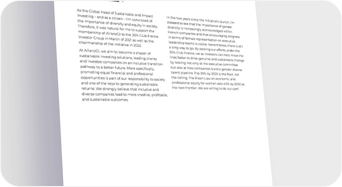 2022 Annual Report 6 30% Club France Investor Group As the Global Head of Sustainable and Impact Investing – and as a citizen – I’m convinced of the importance of diversity and equity in society. Therefore, it was natural for me to support the membership of AllianzGI to the 30% Club France Investor Group in March of 2021 as well as the chairmanship of the initiative in 2022. At AllianzGI, we aim to become a shaper of sustainable investing solutions, leading clients and investee companies on an inclusive transition pathway to a better future. More specifically, promoting equal financial and professional opportunities is part of our responsibility to society and one of the keys to generating sustainable returns. We strongly believe that inclusive and diverse companies lead to more creative, profitable, and sustainable outcomes. Matt Christensen, Global Head Sustainable & Impact Investment, Allianz Global Investors In the two years since the initiative’s launch, I’m pleased to see that the importance of gender diversity is increasingly acknowledged within French companies and that encouraging progress in terms of female representation on executive leadership teams is visible. Nevertheless, there is still a long way to go. By pooling our efforts under the 30% Club France, we as investors can help move the lines faster to drive genuine and sustainable change by looking not only at the executive committee but also at how companies build a gender-diverse talent pipeline. The 30% by 2025 is the floor, not the ceiling. The Rixain Law on economic and professional equity for women sets 40% by 2030 as the next f rontier. We are willing to do our part!