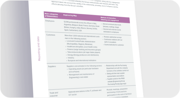 ESG / Sustainability Report / 2022 ESG / Sustainability Report / 2022 Our Stakeholders GRI 2-29 The table below illustrates Engineering’s main stakeholder categories, along with the engagement methods and types of activities whereby the Group communicates and interacts with them. This approach takes into account the validity of the relationship, proximity, level of influence and the effects deriving from the Group’s activities. Main categories Engineering Map Method of interaction, Main categories Engineering Map Method of interaction, of Stakeholders listening and engagement of Stakeholders listening and engagement Employees 12,546 professionals across the oces in: Italy, • Internal communication tools Non-profit world • Associations for the promotion Sponsorships, charitable contributions, Argentina, Belgium, Brazil, France, Germany, Great (Intranet, mailings, blogs) of the environment transfer of goods or services, projects Britain, Hungary, India, Mexico, Norway, Serbia, • Internal and external events • Cooperatives/Non-profit organizations in partnership, training and in-company Spain, Switzerland, USA dedicated to employees Internship Customers More than 1,000 national and international custo- • Periodic satisfaction surveys Trade unions Metalworking industry trade unions • Collective and regional mers in the following sectors: • Continuous relations with our bargaining Reporting and data • Local and Central Public Administration sta of consultants • Meetings with company trade union (Municipalities, Regions, Ministries) • Events dedicated to customers • Healthcare (Hospitals, Local Health Units) Universities and National and European university and research • Development of projects in • Finance (Large banking and insurance groups) Research institutions partnership, economic support for • Telecommunications (all major Italian players) institutions research, training and support for • Energy (Energy producers and distributors) research and development of products • Industry • Company testimonials at Educational Reporting and data • European and international institutions institutions Suppliers Suppliers concentrated in the following sectors: • Relationships with the Purchasing Media • National newspapers, periodicals and radio • Contacts during the launch • Operating assets (in particular hardware Department and with the company and television broadcasters of relevant projects, publication and software) functions of the activities carried out • Trade magazines of company documents, interviews, • Management and maintenance of • Dialog with the main supplier • Local newspapers and radio and television events Engineering’s real estate representation associations broadcasters • Supplier portal on the PAGE website (Engineering Group Project partners • Italian and European small and • Coordination as part of projects Purchasing Portal) page.eng.it large companies (e.g., energy, financed by European and national healthcare sector) public entities Trade and National associations in the IT, software and Periodic meetings, preparation • Development of projects in partnership industrial ICT sector and sharing of best practices associations participation in the work of technical and representation commitees Financial institutions National and international banks and Credit Meetings with the company’s top insstitutions that fibìnance the Group’s main management investments 94 Engineering © Engineering © 95