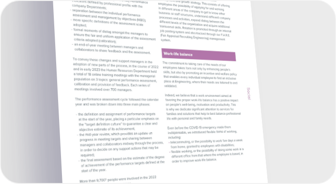 ESG / Sustainability Report / 2022 ESG / Sustainability Report / 2022 such as LinkedIn and Instagram, so as to reach as many technical institutes, providing specific technical lessons Implemented between 2019 and 2020, our performance Growing skills through Job Posting people as possible. Social media channels were further directly in the classroom with a view to training students management process was revised further in 2022 in order and Job Rotation enhanced and refined in 2022: aside from the YouTube and providing them with all of the skills required to enhance to improve its robustness and effectiveness. In particular, channel and the institutional profiles present on Facebook and their talent and be prepared for entry into the job market. the following new features were introduced in 2022 and Job rotation is a significant element of our skills Twitter, the company’s Instagram account @LifeAtEngineering In light of the success achieved in the year in which it have been retained in 2023 as well:development and growth strategy. This consists of offering is, for example, focused on talking about life and events in the was launched, the “Introduce a friend” internal recruiting - a library of goals and the respective Key Performance employees the possibility of applying for and working Group and has more than 4,000 followers, 52.2% of whom are campaign was carried out in 2022 as well. The initiative Indicators defined by professional profile with the in different areas of the company to get to know other between 18 and 34 years of age. aims to identify and find specific, highly rare profiles in the company Departments;business or staff structures, understand different company market by offering employees the possibility of submitting - separation between the individual performance processes and activities, expand dialog between the In the course of 2022, LinkedIn became the fundamental the CVs of friends, relatives and acquaintances to create assessment and management by objectives (MBO);different levels of the organization and acquire additional channel for employer branding as well as candidate search a new and important source for intercepting and selecting - more specific definitions of the assessment scale transversal skills. Rotation is promoted through an internal purposes. The Engineering page exceeded 107,000 new candidates. adopted; job posting system and also tracked through our F.A.R.E. followers. In March 2023, Engineering was recognized - formal moments of dialog amongst the managers to (Fair Appraisal Recruiting Engineering) management as one of the 3 finalist companies for the “Best Employer ensure the fair and uniform application of the assessment system. Brand on LinkedIn” and “Best Talent Acquisition Team” Investing in people, a benefit for the Groupcriteria adopted (calibration); awards. The recognitions were assigned on the basis of - an end-of-year meeting between managers and objective data, relating to the degree of engagement and Our capacity to develop and cultivate talent and boost the collaborators to share feedback and the assessment. Work-life balance interaction with our Company Page and the use of the tool professional skills of our people is an essential factor to by recruiters during 2022. keep a high level of engagement and collaboration in the To convey these changes and support managers in the The commitment to taking care of the needs of our company. It is also essential to bring value to our customers adoption of new parts of the process, in the course of 2022 employees takes form not only by enhancing people’s Furthermore, Engineering received the Top Climber STEM and the ecosystem of which our company is part. and in early 2023 the Human Resources Department held skills, but also by promoting an incentive and welfare policy special award at the Universum Awards Italy 2022, for For us, investing in people concretely means: a total of 18 online training meetings with the managerial that enables every individual employee to find an inclusive having increased its ranking by 18 positions compared • adopting a performance assessment system aimed at the population on 3 topics: general performance assessment, place at Engineering, where their needs are listened to and to 2021, thus becoming one of the 50 best companies growth of each and every team member, which is also calibration and provision of feedback. Each series of validated. Social according to students in the Engineering/IT/Natural Science consistent with specific and shared goals;meetings involved over 700 managers. Socialcategory. • offering a number of training paths for all employees, Indeed, we believe that a work environment aimed at targeted at the development of technical skills and The performance assessment cycle followed the calendar favoring the proper work-life balance has a positive impact In continuity with the prior year, talent selection took specific soft skills;year and was broken down into three main phases: on people’s well-being, motivation and productivity. This place in the Cornerstone Recruitment suite called F.A.R.E. • defining professional areas and employee profiles in line is why we dedicate significant attention to services for (Fair Appraisal Recruiting Engineering), which enabled us with the reference market (job architecture);- the definition and assignment of performance targets families and solutions that help to best balance professional to implement a series of new, entirely digital and virtual • ensuring a continuous flow of communication through at the start of the year, placing a particular emphasis on life with personal and family needs. processes and immediately achieve significant results. This events and meetings between management and the “target definition culture” to guarantee a clear and important work is intended to fully transfer the new hire employees at every level.objective estimate of its achievement;Even before 