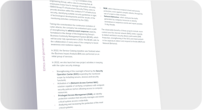 ESG / Sustainability Report / 2022 CSR / Bilancio di Sostenibilità / 2022 - ISM03 Group Information Classification Policy: defines the basic controls for classifying information of the Engineering Group, with a view to ensuring that all employees know how to manage information securely. • MDR, which improves endpoint (client and server) - ISM04 Group IT Infrastructure Security Policy: aims to protection, even against complex attacks, through the provide direction within the context of IT infrastructure use of a best in class solution; security, identifying suitable security guidelines in light • Network Behaviour, which analyzes the traffic of technological developments and the results of the generated by company resources to identify monitoring activities conducted by the CISO. anomalous or suspicious events and report possible 0-day threats. Taking into consideration the continuous evolution of cyber attacks, the company has embarked upon a path The observable benefits of these projects include: more of strengthening its adverse event response capacity, control over the internal network (NAC), better capacity formalized in the design of the Engineering Group’s to detect and block security attacks and events (DNS Business Continuity Management System (BCMS), which Protection, strengthening of the SOC) and improvement will become fully operational in 2023. The BCMS calls for in the capacity to detect and respond to threats (MDR and the collaboration of every area of the company to boost Network Behavior). Etica e governance awareness and resilience capacity. In 2022, the Service Catalog baseline was finalized when the Business Impact Analysis (BIA) was performed on an initial group of services. In 2022, we also launched new project activities in keeping with the cyber security strategy: Ethics and governance• Strengthening of the oversight offered by the Security Operation Center (SOC) expanding the monitored scope by including servers, devices and security functions; • Activation of a (Network Access Control: NAC) solution capable of verifying compliance with endpoint security policies before allowing access to company resources; • Privileged Access Management (PAM), an identity protection solution that securely manages and stores critical system access credentials; • Analyzing and increasing the protection of the most critical systems; The most significant projects concluded in 2022 intended to improve the security of IT systems and the data used are described below. In detail, the following solutions were implemented: • DNS Protection, which is used to identify and block threats linked to online navigation; 68 Engineering © Engineering © 69