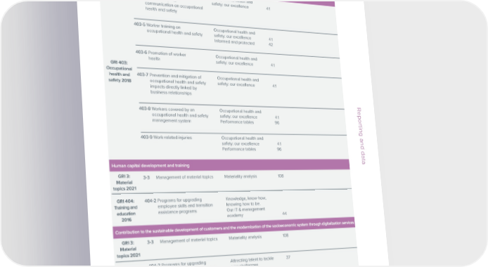 ESG / Sustainability Report / 2022 ESG / Sustainability Report / 2022 GRI Standard Disclosures References, links Page Omissions GRI Standard Disclosures References, links Page Omissions and notes Requirement Reason Explanation and notes Requirement Reason Explanation Energy eciency and climate change Health, safety and well-being at work 305-3 Management of material topicsCombating climate 403-4 Worker participation, Occupational health and change in processes23 consultation, and safety: our excellence 41 Performance tables96 communication on occupational GRI 305: health and safety EmissionsOther indirect (Scope 3)The calculation in the GHG emissionsreporting of direct and indirect 2016consumption and the 403-5Worker training on Occupational health and associated tCO emissions occupational health and safety safety: our excellence 41 2 does not include all oces Informed and protected 42 of the Engineering Group companies in Italy 403-6Promotion of worker Occupational health and Gestione dei rifiuti health safety: our excellence 41 GRI 403: GRI 3: 3-3Management of material topicsMateriality analysis108Occupational Material health and 403-7 Prevention and mitigation of Occupational health and topics 2021 safety 2018 occupational health and safety safety: our excellence 41 impacts directly linked by 306-1 Waste generation and From Sustainable business relationships significant waste-related Procurement to asset impactsend of life27 Reporting and data GRI 306: 403-8 Workers covered by an Occupational health and Waste 306-2Management of significantFrom Sustainable occupational health and safety safety: our excellence 41 2020waste-related impactsProcurement to asset management system Performance tables 96 end of life27 403-9Work-related injuries Occupational health and 306-3 Waste generatedPerformance tables96 safety: our excellence 41 Performance tables 96 Contributo all’occupazione Reporting and dataGRI 3: 3-3Management of material topicsMateriality analysis108 Human capital development and training Material topics 2021 GRI 3: 3-3 Management of material topics Materiality analysis 108 Material GRI 401:401-1 New employee hires andValuing diversity to grow36topics 2021 Employmentemployee turnoverPerformance tables96 2016 GRI 404: 404-2Programs for upgrading Knowledge, know-how, Training and employee skills and transition knowing how to be. Health, safety and well-being at workeducation assistance programs Our IT & management 2016 academy 44 GRI 3: 3-3Management of material topicsMateriality analysis108 Material Contribution to the sustainable development of customers and the modernization of the socioeconomic system through digitalization services topics 2021 GRI 3: 3-3 Management of material topics Materiality analysis 108 Material 403-1 Occupational health and safety Occupational health and 41topics 2021 management systemsafety: our excellence GRI 404: 404-2Programs for upgrading Attracting talent to tackle 37 GRI 403: Training and employee skills and transition new challenges 403-2 Hazard identification,Occupational health and 41education assistance programs Occupational risk assessment, and incident safety: our excellence health and investigation 2016 safety 2018 403-3 Occupational health servicesOccupational health and 41 safety: our excellence 118 Engineering © Engineering © Engineering © 119