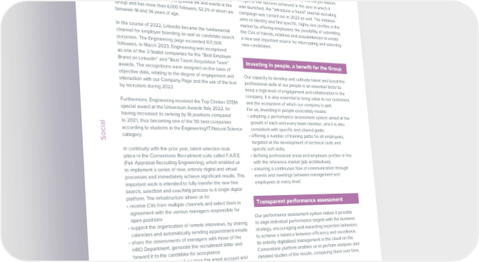 ESG / Sustainability Report / 2022 ESG / Sustainability Report / 2022 such as LinkedIn and Instagram, so as to reach as many technical institutes, providing specific technical lessons Implemented between 2019 and 2020, our performance Growing skills through Job Posting people as possible. Social media channels were further directly in the classroom with a view to training students management process was revised further in 2022 in order and Job Rotation enhanced and refined in 2022: aside from the YouTube and providing them with all of the skills required to enhance to improve its robustness and effectiveness. In particular, channel and the institutional profiles present on Facebook and their talent and be prepared for entry into the job market. the following new features were introduced in 2022 and Job rotation is a significant element of our skills Twitter, the company’s Instagram account @LifeAtEngineering In light of the success achieved in the year in which it have been retained in 2023 as well: development and growth strategy. This consists of offering is, for example, focused on talking about life and events in the was launched, the “Introduce a friend” internal recruiting - a library of goals and the respective Key Performance employees the possibility of applying for and working Group and has more than 4,000 followers, 52.2% of whom are campaign was carried out in 2022 as well. The initiative Indicators defined by professional profile with the in different areas of the company to get to know other between 18 and 34 years of age. aims to identify and find specific, highly rare profiles in the company Departments; business or staff structures, understand different company market by offering employees the possibility of submitting - separation between the individual performance processes and activities, expand dialog between the In the course of 2022, LinkedIn became the fundamental the CVs of friends, relatives and acquaintances to create assessment and management by objectives (MBO); different levels of the organization and acquire additional channel for employer branding as well as candidate search a new and important source for intercepting and selecting - more specific definitions of the assessment scale transversal skills. Rotation is promoted through an internal purposes. The Engineering page exceeded 107,000 new candidates. adopted; job posting system and also tracked through our F.A.R.E. followers. In March 2023, Engineering was recognized - formal moments of dialog amongst the managers to (Fair Appraisal Recruiting Engineering) management as one of the 3 finalist companies for the “Best Employer ensure the fair and uniform application of the assessment system. Brand on LinkedIn” and “Best Talent Acquisition Team” Investing in people, a benefit for the Group criteria adopted (calibration); awards. The recognitions were assigned on the basis of - an end-of-year meeting between managers and objective data, relating to the degree of engagement and Our capacity to develop and cultivate talent and boost the collaborators to share feedback and the assessment. Work-life balance interaction with our Company Page and the use of the tool professional skills of our people is an essential factor to by recruiters during 2022. keep a high level of engagement and collaboration in the To convey these changes and support managers in the The commitment to taking care of the needs of our company. It is also essential to bring value to our customers adoption of new parts of the process, in the course of 2022 employees takes form not only by enhancing people’s Furthermore, Engineering received the Top Climber STEM and the ecosystem of which our company is part. and in early 2023 the Human Resources Department held skills, but also by promoting an incentive and welfare policy special award at the Universum Awards Italy 2022, for For us, investing in people concretely means: a total of 18 online training meetings with the managerial that enables every individual employee to find an inclusive having increased its ranking by 18 positions compared • adopting a performance assessment system aimed at the population on 3 topics: general performance assessment, place at Engineering, where their needs are listened to and to 2021, thus becoming one of the 50 best companies growth of each and every team member, which is also calibration and provision of feedback. Each series of validated. Social according to students in the Engineering/IT/Natural Science consistent with specific and shared goals; meetings involved over 700 managers. Social category. • offering a number of training paths for all employees, Indeed, we believe that a work environment aimed at targeted at the development of technical skills and The performance assessment cycle followed the calendar favoring the proper work-life balance has a positive impact In continuity with the prior year, talent selection took specific soft skills; year and was broken down into three main phases: on people’s well-being, motivation and productivity. This place in the Cornerstone Recruitment suite called F.A.R.E. • defining professional areas and employee profiles in line is why we dedicate significant attention to services for (Fair Appraisal Recruiting Engineering), which enabled us with the reference market (job architecture); - the definition and assignment of performance targets families and solutions that help to best balance professional to implement a series of new, entirely digital and virtual • ensuring a continuous flow of communication through at the start of the year, placing a particular emphasis on life with personal and family needs. processes and immediately achieve significant results. This events and meetings between management and the “target definition culture” to guarantee a clear and important work is intended to fully transfer the new hire employees at every level. objective estimate of its achievement; Ev