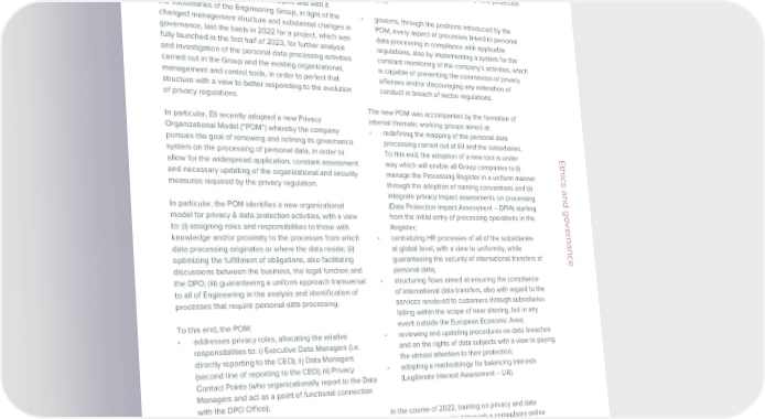 ESG / Sustainability Report / 2022 ESG / Sustainability Report / 2022 In the Supplier Register (PAGE) enrollment phase, 100% of • guarantees the progressive implementation of a suppliers are required to view them and be familiar with The new Privacy Organizational Model structured and organic system of procedures and their terms. (POM) control activities (ex ante and ex post) aimed at preventing as well as overseeing any data protection Engineering takes all necessary measures to combat and in October 2022. In the anti-corruption compliance risks; prevent corruption, prohibiting any action that may promote improvement program, the prevention policy was extended Engineering Ingegneria Informatica S.p.A. and with it or favor interests and advantages by third parties, or harm to all Italian and foreign companies. the subsidiaries of the Engineering Group, in light of the • governs, through the positions introduced by the impartiality and autonomy of judgment. changed management structure and substantial changes in POM, every aspect of processes linked to personal In compliance with the standard, in 2019 the “Anti-governance, laid the basis in 2022 for a project, which was data processing in compliance with applicable In 2019, the Parent Company earned, and subsequently Corruption Compliance Function” was established, which fully launched in the first half of 2023, for further analysis regulations, also by implementing a system for the renewed in 2022, the certification of its Anti-Bribery reports directly to the Chief Executive Officer and in the and investigation of the personal data processing activities constant monitoring of the company’s activities, which Management System according to the ISO 37001 course of 2020 was also extended to Municipia. carried out in the Group and the existing organizational, is capable of preventing the commission of privacy international standard, issued by the certification body DNV To spread the tools adopted for preventing and fighting management and control tools, in order to perfect that offenses and/or discouraging any reiteration of – Italia. This standard is applicable to any type of public or against corruption, the company dedicates specific training structure with a view to better responding to the evolution conduct in breach of sector regulations. private organization and describes the requirements for sessions to its employees which address topics such as of privacy regulations. implementing a management system aimed at preventing the Organization and Management Model adopted by The new POM was accompanied by the formation of corruption, oriented towards continuous improvement and Engineering in compliance with Italian Legislative Decree In particular, EII recently adopted a new Privacy internal thematic working groups aimed at: the adoption of measures to discourage the risk of offenses 231/2001 and in general the company’s anti-corruption Organizational Model (“POM”) whereby the company • redefining the mapping of the personal data in a reasonable manner proportional to the business approach: in 2022, the “Anti-corruption course” was taken pursues the goal of renewing and refining its governance processing carried out at EII and the subsidiaries. segment, size and complexity of the organization. The in Web Based Training (WBT) mode by 3,169 employees system on the processing of personal data, in order to To this end, the adoption of a new tool is under Ethics and governance system is not meant to overlap with the tools established belonging to the Group’s Italian companies. allow for the widespread application, constant assessment way which will enable all Group companies to (i) by law (corruption prevention plans pursuant to Law 190 or and necessary updating of the organizational and security manage the Processing Register in a uniform manner Organization Models pursuant to Italian Legislative Decree measures required by the privacy regulation. through the adoption of naming conventions and (ii) 231), but only to best coordinate the overall system in order Data privacy and cybersecurity integrate privacy impact assessments on processing to effectively prevent corruption in a manner integrated In particular, the POM identifies a new organizational (Data Protection Impact Assessment – DPIA) starting with other company management systems. model for privacy & data protection activities, with a view from the initial entry of processing operations in the Privacy: a continuously evolving regulationto: (i) assigning roles and responsibilities to those with Register; In 2021, the subsidiary Municipia obtained the certification, The European General Data Protection Regulation (GDPR) knowledge and/or proximity to the processes from which • centralizing HR processes of all of the subsidiaries while the subsidiary D.HUB earned the certification became effective in May 2018 and contains a complex set data processing originates or where the data reside; (ii) at global level, with a view to uniformity, while Ethics and governanceof rules on the protection of the data of natural persons. optimizing the fulfillment of obligations, also facilitating guaranteeing the security of international transfers of Subsequent to the adoption of the GDPR, the regulator, discussions between the business, the legal function and personal data; the European Data Protection Board (European Board that the DPO; (iii) guaranteeing a uniform approach transversal • structuring flows aimed at ensuring the compliance brings together representatives of the Privacy Authorities to all of Engineering in the analysis and identification of of international data transfers, also with regard to the of the Member States) and the Supervisory Authorities processes that require personal data processing. services rendered to customers through subsidiaries took action multiple times, expressing opinions and issuing falling within the scope of near shoring, but in any