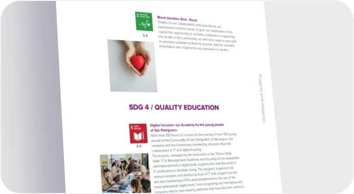 ESG / Sustainability Report / 2022 ESG / Sustainability Report / 2022 Initiatives in favor of the community SDG 1 / END POVERTY IN ALL ITS Blood donation: Ema - Roma FORMS EVERYWHERE Thanks to our collaboration with Ema-Roma, we participated in blood drives to give our employees in the capital the opportunity to actively contribute to supporting 3.4 the health of the community, as well as to make a specialist From Brazil, a show for ecology and inclusionin vaccines available to them to provide specific scientific From the shanty towns of Brazil to the Vatican, 24 young information and respond to any questions or doubts. people from the favelas are the stars of the show “Lo spazio della vita nella terra” (“The space of life on earth”), with a view to sending an ecological and social message 1.Bon a tour that will reach Italy and France. At the end of the tour a documentary film entitled “Amazonia. The Space of Projects and initiatives Life on Earth” will be created, featuring the most significant moments of this trip and interviews with four of the young people involved in this project, of which the Engineering Group is one of the main sponsors. On May 24, 2023, the show arrived at the Vatican, where the Brazilian dance group Laudato Si’ Amazonia – O Espaço da Vida na Terra participated in the general audience and then danced in SDG 4 / QUALITY EDUCATION the colonnade area of Saint Peter’s Square. Projects and initiatives Digital inclusion: our Academy for the young people of San Patrignano SDG 3 / GOOD HEALTH AND More than 150 hours of courses for the training of over 100 young people in the Community of San Patrignano. In this project, our WELLBEING 4.4 company and the Community founded by Vincenzo Muccioli collaborated in IT and digital training. The lessons, managed by the instructors of the “Enrico Della Engineering for the Cure Valle” IT & Management Academy and focusing on the acquisition Again in 2022, Engineering participated in the Rome and improvement of digital skills, support entry into the world of stage of Race for the Cure, the initiative aimed at raising IT professions to facilitate hiring. The program, organized into awareness about the importance of prevention in the fight various modules and divided by level of IT skill, ranged from the 3.4against breast cancer. Also this year, our employees and use and functioning of PCs and smartphones to the use of the their families participated in the non-competitive walk most widespread digital tools, from recognizing and managing web organized by the Susan G. Komen Italia association.browsing risks to new sharing platforms that have become central in telecommuting. For our Group, training means contributing to a more fair and inclusive society. This project is aimed specifically at involving the students at San Patrignano so they can become familiar with and benefit from the opportunities of a digital transformation that is changing the world. 50 Engineering © Engineering © 51