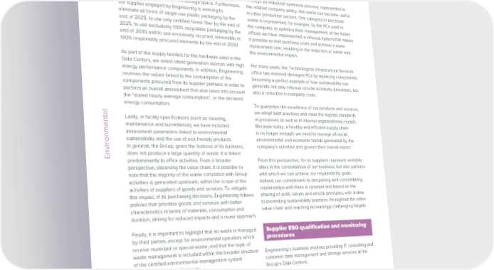 ESG / Sustainability Report / 2022 ESG / Sustainability Report / 2022 to reducing the weight and volume occupied by the To reduce our environmental impact to a minimum, all of package and selecting the material of which it is composed: the waste produced is sent to specialized and certified • operating assets (primarily hardware, basic software, preferably paper and cardboard. In this context, the change companies for proper material recovery. middleware and applications intended for internal use, in the computer supply reduced the volume of packaging resale or the provision of outsourcing services and the used by roughly 40%, therefore decreasing the resulting Through an industrial symbiosis process, represented in development of digital solutions for customers) waste production and required storage space. Furthermore, the relative company policy, this waste can become useful • company vehicles • guaranteeing that they have no ongoing proceedings the supplier engaged by Engineering is working to in other production sectors. One category of electronic • mobile and landline telecommunications against them for any of the types of offense governed eliminate all forms of single-use plastic packaging by the waste is represented, for example, by the PCs used in • business travel by Italian Legislative Decree no. 231/2001, or any end of 2025, to use only certified forest fiber by the end of the company: to optimize their management, at the Italian • real estate management and maintenance precautionary measures or convictions; 2025, to use exclusively 100% recyclable packaging by the offices we have implemented a virtuous system that makes • professional IT services • certifying that they have viewed our Code of Ethics, end of 2030 and to use exclusively recycled, renewable or it possible to limit purchase costs and achieve a lower • other consulting our 231 Organization and Management Model and our 100% responsibly procured elements by the end of 2030. replacement rate, resulting in the reduction of waste and Policy for the prevention of corruption and committing to the environmental impact. In order to guarantee high quality standards in the respecting its content, principles and procedures; As part of the supply tenders for the hardware used in the services offered to customers, we have for some time now • declaring that they have duly trained their personnel Data Centers, we select latest generation devices with high For many years, the Technological Infrastructure Services formalized the supplier qualification procedure, defined regarding the provisions laid down in Italian Legislative energy performance components. In addition, Engineering office has restored damaged PCs by replacing components, by our company policy on purchases, which calls for a Decree no. 231/2001 and that they have set up receives the values linked to the consumption of the becoming a perfect example of how sustainability can continuous assessment in order to ensure the effectiveness supervisory and control mechanisms in order to prevent components procured from its supplier partners in order to generate not only virtuous circular economy processes, but and reliability of the relationship over time. offenses from being committed; perform an overall assessment that also takes into account also a reduction in company costs. • having suppliers state that they are willing to allow the the “stated hourly average consumption”, or the declared When a new contractual relationship begins, every supplier performance of controls by Engineering’s Supervisory energy consumption. To guarantee the excellence of our products and services, proceeds with registration and the entry in a dedicated Body; we adopt best practices and meet the highest standards portal of the specific technical, economic and financial • sharing the commitment of the Engineering Group to Environmental Lastly, in facility specifications (such as cleaning, in processes as well as in internal organizational models. information established by law, also regarding corporate sustainability and social responsibility, specifying this maintenance and surveillance), we have included Because today, a healthy and efficient supply chain social responsibility topics, such as: valid Certificate through the ESG questionnaire on the organization’s assessment parameters linked to environmental is no longer enough: we need to manage all social, of Social Security Compliance (“DURC”); Chamber of ethics and integrity, the prevention of corruption, equal sustainability and the use of eco-friendly products. environmental and economic trends generated by the Commerce Certificate (optional); valid Tax Compliance opportunities, diversity and inclusion, social reporting, In general, the Group, given the features of its business, company’s activities and govern their overall impact. Certificate (“DURF”); Financial Statements. health and safety and the environment. Environmentaldoes not produce a large quantity of waste: it is linked predominantly to office activities. From a broader From this perspective, for us suppliers represent veritable Having reviewed this documentation, the manager of the The supplier qualification process has been strengthened perspective, observing the value chain, it is possible to allies in the consolidation of our business, but also partners supplier office may suspend the supplier’s qualification if with the sustainability assessment and monitoring of all new note that the majority of the waste correlated with Group with which we can achieve our responsibility goals. the documentation transmitted is not suitable or complete, Engineering Group Italy suppliers. In the Page platform, the activities is generated upstream, within the scope of the Indeed, our commitment to deepening and consolidating inform it of any anomalies or validate the procedure and Group provides the questionnaire to its suppliers, which activitie