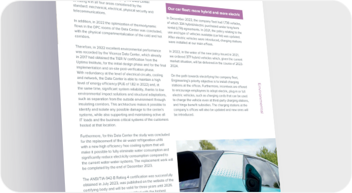 ESG / Sustainability Report / 2022 ESG / Sustainability Report / 2022 Green Data Center, energy sustainability Particularly with regard to the Vicenza Data Center, in the models course of 2022 the process was initiated of recertifying compliance with the ANSI/TIA-942-B standard, which takes Our Data Centers guarantee the management of the IT place every three years. technological infrastructure on which all of the Group’s Italian offices rely for their remote activities and therefore The objective consists of certifying the Data Center guarantee the quality of the services we offer to our at Rating 4 in all four areas considered by the Our car fleet: more hybrid and more electric customers. standard: mechanical, electrical, physical security and telecommunications. In December 2022, the company fleet had 1,736 vehicles, The proper and responsible management of the impact of which 334 hybrid/electric purchased under long-term generated by our Data Centers on the ecosystem, In addition, in 2022 the optimization of thermodynamic rental (LTR) agreements. In 2021, the policy relating to the mainly with the production of electronic waste and the flows in the DPC rooms of the Data Center was concluded, use and type of vehicles available (car list) was updated. consumption of electricity (IT equipment as well as cooling, with the physical compartmentalization of the cold and hot After electric vehicles were introduced, charging stations ventilation and electrical distribution systems), is one of corridors. were installed at our main offices. our priorities, and we demonstrate this through constant investments aimed at achieving excellence in terms of Therefore, in 2022 excellent environmental performance In 2022, in the wake of the new policy issued in 2021, environmental sustainability. was recorded by the Vicenza Data Center, which already we ordered 377 hybrid vehicles which, given the current in 2017 had obtained the TIER IV certification from the market situation, will be delivered in the course of 2023- Uptime Institute, for the initial design phase and for the final 2024. implementation and on-site post-verification phase. turned on 24/7, with LED lights was also planned. This With redundancy at the level of electrical circuits, cooling On the path towards electrifying the company fleet, The Pont-Saint-Martin energy efficiency project Since 2011, the Pont-Saint-Martin Data Center in Valle replacement has limited benefits in terms of energy and network, the Data Center is able to maintain a high Engineering’s priority objective is to install charging Environmental d’Aosta has had a geothermal cooling system, which efficiency, but in any event has important advantages as level of energy efficiency (PUE of 1.82 in 2022) and, at stations at the offices. Furthermore, incentives are offered works by exploiting the water present in the aquifer below, concerns the modernization and life of the lighting systems. the same time, significant system reliability, thanks to low to encourage employees to adopt electric, plug-in or full characterized by a constant temperature of roughly 13 environmental impact solutions and structural adaptations, electric vehicles, such as charging cards that can be used degrees. In May 2021, a project was initiated to increase Furthermore, in 2022 the project of compartmentalizing such as separation from the outside environment through to charge the vehicle even at third-party charging stations, the structure’s capacity by drilling two additional wells thermodynamic flows within the bunker continued, making insulating corridors. This architecture makes it possible to and fringe benefit subsidies. The charging stations at the Environmental(and completely updating the plant’s technology) and it possible to keep heat and cold separate, generating identify and isolate any possible damage to the center’s company’s offices will also be updated and new ones will boosting the capacity to withdraw the water used for benefits from lower temperatures in the server rooms and, systems, while also supporting and maintaining active all be introduced. cooling (from 50 l/s to 96 l/s). The investment immediately hence, a decrease in the energy required for cooling. IT loads and the business critical systems of the customers began to generate some benefits: the refrigeration units hosted at that location. used to cool water (7 degrees) were turned off and the An additional environmental benefit of this new plant consumption of kWh decreased, allowing for significant structure consists of the recovery of part of the heat Furthermore, for this Data Center the study was concluded savings in the purchase of electricity. In particular, the present in the water in the return circuit, which is used for for the replacement of the air-water refrigeration units initial consistent results of this initiative were recorded in heating the offices, lowering the atmospheric emissions with a new high efficiency free cooling system that will November-December 2021. Confirming the excellent level linked to the combustion of methane and the costs of make it possible to fully eliminate water consumption and of efficiency, in 2022 the Pont-Saint-Martin Data Center purchasing it. significantly reduce electricity consumption compared to further reduced its PUE (Power Usage Effectiveness, the the current water-water systems. The replacement work will parameter that measures energy sustainability), from 1.51 be completed by the end of December 2023. to 1.48, following the completion of the hydronic project. In 2022, the replacement of all neon lights, which are The ANSI/TIA-942-B Rating 4 certification was successfully obtained in July 2023, was published on the website of the certifying body and will be valid for three years until 2026. This makes the Data Center certified with the highest In April 2022, activities at the Assago Data Center were degree of reliability on the basis of ANSI/TIA-942B as