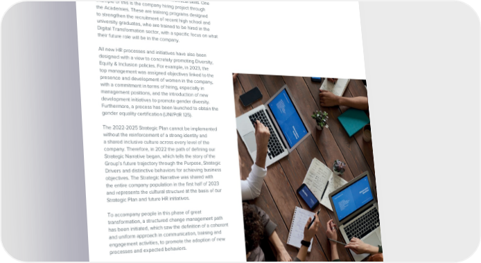 ESG / Sustainability Report / 2022 ESG / Sustainability Report / 2022 Our 2022-2025 human resourceThe Group’s objectives are aimed not only internally, but management strategyhave also focused on strengthening employer branding and improving the offer to candidates, in order to attract new talent with the highest specific technical skills. One example of this is the company hiring project through the Academies. These are training programs designed by to strengthen the recruitment of recent high school and Alessia D’Addario (Engineering Chief Human Resources Officer)university graduates, who are trained to be hired in the Digital Transformation sector, with a specific focus on what In our business sector, innovation and change are essential their future role will be in the company. elements to which we are committed. Therefore, we work constantly to adjust our operating model to the best All new HR processes and initiatives have also been practices and evolutions of the Digital Transformation designed with a view to concretely promoting Diversity, market, of which we are the leader.Equity & Inclusion policies. For example, in 2023, the top management was assigned objectives linked to the The human resource management path is defined in the In 2022, the Company began to transform its entire presence and development of women in the company, 2022-2025 People Strategy and supports the strategic operating model, which impacted the organization, with a commitment in terms of hiring, especially in business plan. It is based on three fundamental pillars processes, systems, skills and culture, and the HR team management positions, and the introduction of new which have the following objectives: accompanied that evolution with a view to implementing development initiatives to promote gender diversity. human resource management processes and policies Furthermore, a process has been launched to obtain the • Organization: constructing an effective and competent increasingly inspired by transparency, objectivity, gender equality certification (UNI/PdR 125). organization able to constantly generate the expected standardization and the use of data. We moved from a The 2022-2025 Strategic Plan cannot be implemented Social resultsvertical organization based on independent Business Social• People: guaranteeing strong leadership and a talent Units to a matrix organization based on the concepts of without the reinforcement of a strong identity and pipeline to accelerate present and future business collaboration, shared objectives and the leveraging and a shared inclusive culture across every level of the performancesynergy of technical skills. company. Therefore, in 2022 the path of defining our • Culture: fueling a distinctive identity that is successful Strategic Narrative began, which tells the story of the within the company as well as in the external marketThe new job architecture, which saw its complete adoption Group’s future trajectory through the Purpose, Strategic in mid-2023, made it possible to harmonize and simplify Drivers and distinctive behaviors for achieving business roles and responsibilities, orienting employee development objectives. The Strategic Narrative was shared with on defined and shared career paths. The new variable the entire company population in the first half of 2023 incentive system reflects the new organizational approach and represents the cultural structure at the basis of our and rewards innovative and collaborative conduct. The Strategic Plan and future HR initiatives. new performance assessment process promotes a culture of continuous feedback and drives towards increasingly To accompany people in this phase of great meritocratic resource management.transformation, a structured change management path has been initiated, which saw the definition of a coherent Therefore, with a view to enhancing and retaining human and uniform approach in communication, training and capital, Engineering is working on redefining career engagement activities, to promote the adoption of new paths, reward policies, and differentiated training and processes and expected behaviors. development that ensure accelerated talent growth. 34 Engineering © Engineering © 35
