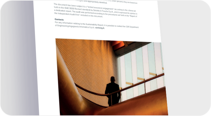 ESG / Sustainability Report / 2022 ESG / Sustainability Report / 2022 Methodological note GRI 2-1 2-2 2-3 2-4 In order to provide the proper representation of the activities reported on and guarantee data This document represents the ninth edition of the Engineering Group’s Sustainability Report reliability, the use of estimates was limited as much as possible and, when present, they are based on (hereinafter, also the “Report”). In particular, the Report refers to Engineering Ingegneria Informatica the best available methodologies and appropriately identified. S.p.A. and the following Italian subsidiaries: Engineering Ingegneria Informatica S.p.A., Municipia S.p.A., Engineering Sardegna S.r.l., Engineering D.Hub S.p.A., Cybertech S.r.l., Webresults S.r.l., Nexen S.p.a, The document has been subject to a “limited assurance engagement” (according to the criteria set 4 forth in the ISAE 3000 Revised standard) by Deloitte & Touche S.p.A., which expressed its opinion in FDL servizi S.r.l., Digitelematica S.r.l. and Livebox S.r.l. , C. Consulting SpA, Atlantic SpA, Plusure SpA. a dedicated report. The audit was performed according to the procedures set forth in the “Report of The Report was drafted in order to describe the economic, social and environmental results achieved the Independent Audit Firm” included in this document. by the Engineering Group, describing the Group’s commitment to creating value not only for itself, but also for its stakeholders. The Report has been drafted in compliance with the “Global Reporting Initiative Contacts Sustainability Reporting Standards”, defined in 2021 by the GRI - Global Reporting Initiative according to For any information relating to the Sustainability Report, it is possible to contact the CSR Department the in accordance reporting option, as specified in the GRI Content Index.of Engineering Ingegneria Informatica S.p.A.: [email protected]. The economic, environmental and social data and information reporting scope refers to the Engineering Group in Italy as described above. Any specifications and exceptions to the reporting scope are indicated in detail in the relevant sections. This document also presents additional data and information relating to the scope abroad, which make it possible to better understand the activities of Engineering. Reporting frequency is annual and the content of this document refers to the year 2022, the period from January 1 to December 31, in alignment with the period reported on in the 2022 Consolidated and Separate Financial Statements, with some information, about projects, provided in relation to the first half of 2023. The content of this document reflects the principle of materiality or relevance. The selection of the topics underlying this Report is the result of the materiality analysis updated according to the indications of the GRI Sustainability Reporting Standard, the main international methodological reference adopted. Reporting and dataThe results of the materiality analysis and the material topics for Engineering are described in the “Materiality analysis” section. Specifically, with reference to the data presented in the report, the scopes taken into consideration with respect to the GRI disclosures are set forth below. When available, data and information relating to prior years are provided only for comparative purposes in order to allow for an assessment of the performance of Group activities over a more extensive period of time. 4 The scope of Engineering Ingegneria Informatica’s Sustainability Report 2022, unlike that of the Consolidated and Separate Fi- nancial Statements 2022, does not include foreign companies and companies partially controlled in Italy (less than 90% controlled). The link to the 2022 Consolidated and Separate Financial Statements published on April 25, 2023 is provided below: https://www. eng.it/resources/who-we-are/pdf/Engineering_ConsolidatedAnnualAccounts2022.pdf, which were prepared in accordance with International Accounting Standards (IAS/IFRS) and take into account the adjustments made to correct errors - as defined by IAS 8 - that emerged following a process of verification of the accounting methods for costs and revenues of some of the orders relating to Engineering’s Finance Division and the subsidiary company Nexen S.p.A. ( the same being part of the Group’s Finance Division), also carried out with the help of external consultants. 106 Engineering © Engineering © 107
