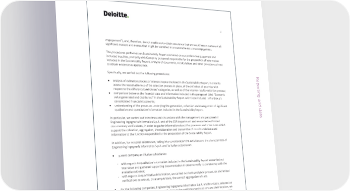 ESG / Sustainability Report / 2022 ESG / Sustainability Report / 2022 External assurance GRI 25 Deloitte & Touche S.p.A. Via Vittorio Veneto, 89 00187 Roma Italia 2 Tel: +39 06 367491 Fax: +39 06 36749282 www.deloitte.it engagement”), and, therefore, do not enable us to obtain assurance that we would become aware of all INDEPENDENT AUDITOR’S REPORT significant matters and events that might be identified in a reasonable assurance engagement. ON THE SUSTAINABILITY REPORT The procedures performed on Sustainability Report are based on our professional judgement and included inquiries, primarily with Company personnel responsible for the preparation of information included in the Sustainability Report, analysis of documents, recalculations and other procedures aimed To the Board of Directors of to obtain evidence as appropriate. Engineering Ingegneria Informatica S.p.A. We have carried out a limited assurance engagement on the Sustainability Report of Engineering Specifically, we carried out the following procedures: Reporting and data Ingegneria Informatica S.p.A. and its Italian subsidiaries, as reported in the 'Methodological Note' section of the Sustainability Report, for the financial year ending 31 December 2022. • analysis of definition process of relevant topics disclosed in the Sustainability Report, in order to assess the reasonableness of the selection process in place, of the definition of priorities with Responsibility of the Board of Directors for the Sustainability Report respect to the different stakeholders’ categories, as well as of the internal results validation process; • comparison between the financial data and information included in the paragraph titled “Economic The Directors of Engineering Ingegneria Informatica S.p.A are responsible for the preparation of the value generated and distributed” in the Sustainability Report with those included in the Group’s Sustainability Report in accordance to the “Global Reporting Initiative Sustainability Reporting Standards” consolidated financial statements; defined by GRI – Global Reporting Initiative (“GRI Standards”), as specified in the “Methodological Note” • understanding of the processes underlying the generation, collection and management of significant paragraph in the Sustainability Report. qualitative and quantitative information included in the Sustainability Report. Reporting and dataThe Directors are also responsible for such internal control as they determine is necessary to enable the preparation of Sustainability Report that is free from material misstatement, whether due to fraud or In particular, we carried out interviews and discussions with the management and personnel of error. Engineering Ingegneria Informatica S.p.A. and of the CSR department and we carried out limited documentary verifications, in order to gather information about the processes and procedures which The Directors are moreover responsible for setting goals of Engineering Ingegneria Informatica S.p.A. and support the collection, aggregation, the elaboration and transmittal of non-financial data and its Italian subsidiaries, with respect to sustainability performance, as well as for the identification of information to the function responsible for the preparation of the Sustainability Report. stakeholders and significant aspects to be reported. In addition, for material information, taking into consideration the activities and the characteristics of Auditor’s Independence and quality control Engineering Ingegneria Informatica S.p.A. and its Italian subsidiaries: We have complied with the independence and other ethical requirements of the Code of Ethics for Professional Accountants issued by the International Ethics Standards Board for Accountants, which is • parent company and Italian subsidiaries: founded on fundamental principles of integrity, objectivity, professional competence and due care, confidentiality and professional behaviour. - with regards to qualitative information included in the Sustainability Report we carried out interviews and gathered supporting documentation in order to verify its consistency with the Our firm applies International Standard on Quality Management 1, which requires the firm to design, available evidence; implement and operate a system of quality management including policies or procedures regarding - with regards to quantitative information, we carried out both analytical procedures and limited compliance with ethical requirements, professional standards and applicable legal and regulatory verifications to ensure, on a sample basis, the correct aggregation of data. requirements. • for the following companies, Engineering Ingegneria Informatica S.p.A. and Municipia, selected on Auditor’s responsibility the basis of their activities, their contribution to the performance indicators and their location, we acquired documental evidence on a sample basis of the correct application of the procedures and Our responsibility is to express our conclusion based on the procedures performed about the compliance calculation methods used for the indicators. of the Sustainability Report with the GRI Standards. We conducted our work in accordance with the criteria established in the “International Standard on Assurance Engagements ISAE 3000 (Revised) – Conclusion Assurance Engagements Other than Audits or Reviews of Historical Financial Information” (hereinafter “ISAE 3000 Revised”), issued by the International Auditing and Assurance Standards Board (IAASB) for Based on the work performed, nothing has come to our attention that causes us to believe that the limited assurance engagements. The standard requires that we plan and perform the engagement to Sustainability Report of Engineering Ingegneria Informatica S.p.A. and its subsidiaries for the fiscal year obtain limited assurance whether the Sustainability Report is free from material misstatement. ended on December 31, 2