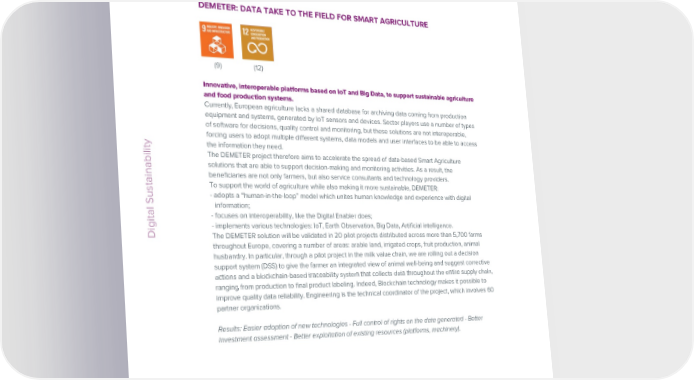 ESG / Sustainability Report / 2022 ESG / Sustainability Report / 2022 DEMETER: DATA TAKE TO THE FIELD FOR SMART AGRICULTURE BEFLEXIBLE: CROSS-SECTOR SERVICES AND INTEROPERABLE PLATFORMS FOR SMART GRIDS (9) (12) (11) (13) (17) Innovative, interoperable platforms based on IoT and Big Data, to support sustainable agriculture and food production systems. We increase the involvement and cooperation of stakeholders in the energy sector to boost their Currently, European agriculture lacks a shared database for archiving data coming from production flexibility. equipment and systems, generated by IoT sensors and devices. Sector players use a number of types The increase in renewable energy sources is profoundly influencing electricity markets and flexibility of software for decisions, quality control and monitoring, but these solutions are not interoperable, demand, as well as the business models of public service and traditional distribution companies. This forcing users to adopt multiple different systems, data models and user interfaces to be able to access requires us to reconsider how energy markets are designed and managed. the information they need. According to recent Clean Energy legislation, Electricity Markets are required to take into account active Digital Sustainability The DEMETER project therefore aims to accelerate the spread of data-based Smart Agriculture citizen participation, as well as the definition and creation of energy communities. BeFlexible boosts solutions that are able to support decision-making and monitoring activities. As a result, the energy flexibility with a view to improving cooperation between distribution system operators (DSOs) beneficiaries are not only farmers, but also service consultants and technology providers. and transmission system operators (TSOs) and facilitating the participation of all sector stakeholders. To support the world of agriculture while also making it more sustainable, DEMETER: BeFlexible defines a new Cross-Sector Data Space concept in which a series of interoperable digital - adopts a “human-in-the-loop” model which unites human knowledge and experience with digital platforms and innovative energy services are implemented and integrated. information; The project calls for the implementation of a Grid Data and Business Network (GDBN) and the definition - focuses on interoperability, like the Digital Enabler does; of system architecture to guarantee full data interoperability and allow for the creation of new business - implements various technologies: IoT, Earth Observation, Big Data, Artificial intelligence. models to provide added value and meet consumer needs in compliance with a stable regulatory Digital SustainabilityThe DEMETER solution will be validated in 20 pilot projects distributed across more than 5,700 farms framework. throughout Europe, covering a number of areas: arable land, irrigated crops, fruit production, animal Engineering is responsible for designing and defining the BeFlexible Common Data Space Architecture husbandry. In particular, through a pilot project in the milk value chain, we are rolling out a decision and supports the Italian demo partners in pilot project implementation and integration in the city of support system (DSS) to give the farmer an integrated view of animal well-being and suggest corrective Rome. actions and a blockchain-based traceability system that collects data throughout the entire supply chain, ranging from production to final product labeling. Indeed, Blockchain technology makes it possible to Results: Facilitating the cooperation and participation of all Energy Stakeholders - Implementing energy improve quality data reliability. Engineering is the technical coordinator of the project, which involves 60 and cross-sector solutions for Energy Stakeholders - Defining a Common Data Space and a Grid Data partner organizations. and Business Network (GDBN). Results: Easier adoption of new technologies - Full control of rights on the data generated - Better investment assessment - Better exploitation of existing resources (platforms, machinery). 86 Engineering © Engineering © 87