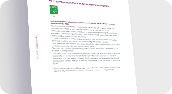 ESG / Sustainability Report / 2022 ESG / Sustainability Report / 2022 VR TO SUPPORT PEOPLE WITH AN AUTISM SPECTRUM CONDITION 5000 GENOMES FOR VALLE D’AOSTA (3) (3) An integrated and innovative solution aimed at supporting young people suffering from autism With High Performance Computing and Machine Learning, we support genomic research for the spectrum disorder (ASD). creation of personalized medicine procedures. Recent research has looked into the effectiveness of Virtual Reality (VR) techniques to treat ASD, The new Valle d’Aosta genomic and Big Data analysis center is integrated with the regional healthcare focusing on the possibility of using it and the clinical impacts for individuals with an ASC. system and aims to generate early diagnoses and personalized treatments for patients being treated Compared to classical interventions, those based on Brain-Computer Interaction (BCI) and VR respond at local hospitals. This represents the opportunity to create a research hub capable of attracting high to a series of characteristics specific to ASD: indeed, patients with ASD react better to visual learning potential to the area, which is able to grow the structure and improve regional healthcare. methods and learn to use computers very quickly. Engineering D. HUB, the technological partner, makes its experience and innovative technologies Digital Sustainability Furthermore, the structure of these treatments is perfectly linear and well organized, with repetitions available in both the infrastructure and the integration and analysis of data to create a high performance that make it possible to reinforce and consolidate learning, with immediate feedback. computing (HPC) infrastructure, a genomic screening structure and a holistic medical record for Lastly, these types of interventions focus on specific skills and training, and the therapist can adjust and patients. The project aims to sequence roughly 5,000 genomes over 5 years on patients suffering from modify the scenarios based on the patient’s individual needs. neurological, neurodegenerative and oncological diseases. In the process, the patient’s genomic profile The project uses a scenario-based learning platform for the creation, release, use and monitoring of is analyzed along with data from their medical history and about their lifestyle to define personalized treatment or training sessions. treatments, also with the aid of artificial intelligence solutions. Each session is tracked directly by the software, which monitors the results and a series of parameters (such as attention and stress levels) collected through webcams and processed by AI algorithms. Results: Patient DNA mapping; Personalized treatment pathways; Medical diagnostics support; New Digital Sustainability Furthermore, a Decision Support System will also be implemented that integrates the data gathered precision diagnostics methodologies; New genomic information analysis methodologies; The medium- during sessions with data managed by the Public Administration and the national and local healthcare and long-term goal is to apply the technological solution and the diagnostic-treatment approach system. developed to other illnesses Results: Improvement in the well-being of the person with an ASC; Improvement in the social context with which the person with an ASC interacts; Improvement of decision-making processes 72 Engineering © Engineering © 73