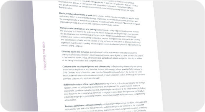 ESG / Sustainability Report / 2022 ESG / Sustainability Report / 2022 Why these topics are important for Engineering Contribution to employment: the sector in which Engineering works is characterized by limited Support for the digital transition and creation of economic value: aware of its responsibility, availability in the market of resources with specialized IT skills, so it is fundamental to enact effective Engineering undertakes to create innovative solutions to assist organizations in their digital talent attraction policies in collaboration with universities. Furthermore, internal development transition, consistent with the current and future scenario and with new business challenges, and growth processes are designed to retain the best resources necessary to enact the Digital providing them with solutions able to increase their abilities to perceive contextual signals and Transformation. interpret and automate the actions to be taken. Furthermore, the business goal is to create wealth and value for all stakeholders by investing in a number of dedicated projects. Health, safety and well-being at work: work activities include risks for employee and supplier health and safety. Within its sustainability strategy, Engineering is committed to improving processes and Education of the general public on digitalization: as a leader of the Digital Transformation for the managerial culture aimed at guaranteeing occupational health and safety. Therefore, training and years now, Engineering makes efforts to promote initiatives to raise community awareness about information policies, procedures and activities are continuously updated digitalization with a view to creating a shared benefit. Through collaborations with local players, Engineering drives a process involving the acquisition of IT knowledge. Human capital development and training: competition in cutting-edge sectors like those in which the Company puts itself to the test every day means that people are Engineering’s main resource; Application of IT technologies for customer environmental sustainability: Engineering works the development and enhancement of human capital therefore constitutes one of the Group’s as an accelerator of the sustainable development of its customers by conceiving of innovative priorities in a continuously evolving context that requires paying particular attention to the updating solutions that generate positive impacts with respect to current and future environmental and development of skills and the creation of new professional roles (such as data scientist) through challenges. This makes it possible to promote inclusive, sustainable industrialization that is significant investments in training. Individual professional development proceeds in parallel with the attentive to the surrounding ecosystem. Reporting and data success of the company. Application of IT technologies to face customer social challenges: Engineering works as Diversity, equity and inclusion: guaranteeing a healthy work environment compliant with the an accelerator of the sustainable development of its customers, influencing the majority of principles of non-discrimination, equal opportunities and equal dignity, inclusion and work-life balance sectors in the social, institutional or business sphere, and conceiving of innovative solutions is fundamental for the Group, which promotes generational, cultural and gender diversity as a driver that generate positive impacts with respect to current and future social challenges. Engineering of the Group’s innovation and competitiveness. contributes to the development of inclusive, sustainable and resilient industrialization by improving the traceability, security and reliability of its customers’ processes. Reporting and dataCustomer data security and privacy and cybersecurity: for Engineering, data security and privacy are of utmost importance, and therefore it stores and manages a large quantity of information at its Energy efficiency and climate change: several activities in the Engineering value chain are Data Centers. Many of the data come from the National Healthcare System, the Central and Local responsible for climate-changing gas emissions. In particular, these activities include: the Public Administration and customers across all of Italy’s production sectors. The Group also plans and production of the Company and the materials purchased from suppliers, the functioning of provides cybersecurity services externally. the Data Centers, the operations of Engineering and its customers, which require significant energy consumption, associated with GHG emissions. Furthermore, the Company is directly and Initiatives in support of the community: Engineering offers its skills and experience for the country’s indirectly responsible for the emissions linked to heating the offices, refrigerant gases for the modernization, not only paying attention to its employees and the people revolving around its data centers, employee travel and the disposal of electronic and other waste. ecosystem, but also moving beyond that, expanding its commitment to the entire community. Indeed, over the years the company has continued to engage in social issues through research and culture Waste management: Engineering’s business does not produce significant quantities of waste; initiatives and projects, promoting initiatives aimed at raising community awareness and generating in addition to waste such as paper, plastics and packaging, it uses materials and electronic added value. equipment to carry out operations that entail the production of the most significant item of waste produced, electronic waste. This derives from the management of the Group’s Data Centers and Business compliance, ethics and integrity: considering the high number of players, often public and is linked to the replacement of system components; another significant item is the PCs used in institutional, with which the Group interacts, an