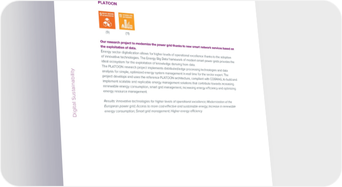 ESG / Sustainability Report / 2022 ESG / Sustainability Report / 2022 PLATOON SMART LAND IN VALMALENCO (9) (11) (3) (7) (9) (11) (12) (17) Our research project to modernize the power grid thanks to new smart network services based on The I.T.I.- Investimento Territoriale Integrato [Integrated Local Investment] ‘In Valmalenco’ project the exploitation of data. for smart and eco-sustainable local developmentThe project Energy sector digitalization allows for higher levels of operational excellence thanks to the adoption The project nvolves four Municipalities in the Lombardy valley (Chiesa in Valmalenco, Caspoggio, of innovative technologies. The Energy Big Data framework of modern smart power grids provides the Lanzada and Spriana), supported by us and CISA, the companies that were awarded the project ideal ecosystem for the exploitation of knowledge deriving from data. financing for project management services over the next 7 years, under the auspices of the Lombardy The PLATOON research project implements distributed/edge processing technologies and data Region for the signing of the Local Development Framework Agreement (“AQST”) as a governance tool. analysis for simple, optimized energy system management in real time for the sector expert. The We presented our project financing to the Municipalities, offering our services, along with CISA, to Digital Sustainability project develops and uses the reference PLATOON architecture, compliant with COSMAG, to build and support the Entities in the enactment of the entire program. We are therefore an “accelerator” that implement scalable and replicable energy management solutions that contribute towards increasing guarantees the implementation of strategic projects, becoming the link between the strategic vision of renewable energy consumption, smart grid management, increasing energy efficiency and optimizing the Municipalities and project implementation. energy resource management. The model is based on 6 broad “thematic pillars”: Mobility, Water, Energy Efficiency, Local development and regeneration, Quality of life and Digitalization. The processing of the data gathered has made it Results: Innovative technologies for higher levels of operational excellence; Modernization of the possible to classify over 100 projects, which have been grouped into a functional matrix and broken European power grid; Access to more cost-effective and sustainable energy; Increase in renewable down by “pillar”. energy consumption; Smart grid management; Higher energy efficiency The project financing calls for creating and managing a technological infrastructure for data collection Digital Sustainability across all of the projects. The parties that will carry out the various projects will therefore need to use the project platforms or, alternatively, transfer all data deemed necessary and indicated in the various project assignment procedures. The main platform that we will offer is the Digital Enabler, in addition to a series of digitalized solutions and services for municipal residents and employees (ARGO). Results: Support in carrying out strategic projects; Technological and transversal data collection infrastructure; Simplicity and effectiveness in carrying out projects for the local area; Use of the project financing methodology 76 Engineering © Engineering © 77