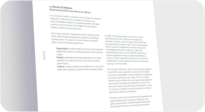 ESG / Sustainability Report / 2022 ESG / Sustainability Report / 2022 Our 2022-2025 human resource The Group’s objectives are aimed not only internally, but management strategy have also focused on strengthening employer branding and improving the offer to candidates, in order to attract new talent with the highest specific technical skills. One example of this is the company hiring project through the Academies. These are training programs designed by to strengthen the recruitment of recent high school and Alessia D’Addario (Engineering Chief Human Resources Officer) university graduates, who are trained to be hired in the Digital Transformation sector, with a specific focus on what In our business sector, innovation and change are essential their future role will be in the company. elements to which we are committed. Therefore, we work constantly to adjust our operating model to the best All new HR processes and initiatives have also been practices and evolutions of the Digital Transformation designed with a view to concretely promoting Diversity, market, of which we are the leader. Equity & Inclusion policies. For example, in 2023, the top management was assigned objectives linked to the The human resource management path is defined in the In 2022, the Company began to transform its entire presence and development of women in the company, 2022-2025 People Strategy and supports the strategic operating model, which impacted the organization, with a commitment in terms of hiring, especially in business plan. It is based on three fundamental pillars processes, systems, skills and culture, and the HR team management positions, and the introduction of new which have the following objectives: accompanied that evolution with a view to implementing development initiatives to promote gender diversity. human resource management processes and policies Furthermore, a process has been launched to obtain the • Organization: constructing an effective and competent increasingly inspired by transparency, objectivity, gender equality certification (UNI/PdR 125). organization able to constantly generate the expected standardization and the use of data. We moved from a The 2022-2025 Strategic Plan cannot be implemented Social results vertical organization based on independent Business Social • People: guaranteeing strong leadership and a talent Units to a matrix organization based on the concepts of without the reinforcement of a strong identity and pipeline to accelerate present and future business collaboration, shared objectives and the leveraging and a shared inclusive culture across every level of the performance synergy of technical skills. company. Therefore, in 2022 the path of defining our • Culture: fueling a distinctive identity that is successful Strategic Narrative began, which tells the story of the within the company as well as in the external market The new job architecture, which saw its complete adoption Group’s future trajectory through the Purpose, Strategic in mid-2023, made it possible to harmonize and simplify Drivers and distinctive behaviors for achieving business roles and responsibilities, orienting employee development objectives. The Strategic Narrative was shared with on defined and shared career paths. The new variable the entire company population in the first half of 2023 incentive system reflects the new organizational approach and represents the cultural structure at the basis of our and rewards innovative and collaborative conduct. The Strategic Plan and future HR initiatives. new performance assessment process promotes a culture of continuous feedback and drives towards increasingly To accompany people in this phase of great meritocratic resource management. transformation, a structured change management path has been initiated, which saw the definition of a coherent Therefore, with a view to enhancing and retaining human and uniform approach in communication, training and capital, Engineering is working on redefining career engagement activities, to promote the adoption of new paths, reward policies, and differentiated training and processes and expected behaviors. development that ensure accelerated talent growth. 34 Engineering © Engineering © 35