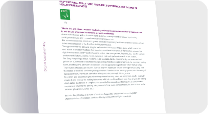 ESG / Sustainability Report / 2022 ESG / Sustainability Report / 2022 EASY HOSPITAL APP: A FLUID AND SIMPLE EXPERIENCE FOR THE USE OF WASTE4THINK FOR THE CIRCULAR ECONOMY HEALTHCARE SERVICES (11) (13) (3) With IoT and Big Data, we create an innovative approach to waste management. “Mobile first and citizen centered” wayfinding and reception ecosystem solution to improve access The adoption of effective solutions to reduce the environmental impact of waste has become a priority to and the use of services for residents at healthcare facilities. for industry as well as for civil society. Imagine if residents and businesses could actively participate A new multi-channel and multi-modal digital experience designed and developed by adopting in initiatives aimed at improving the disposal service, paying only for the management of the waste participatory Service and Human Centered design approaches. actually produced and receiving incentives to reduce quantities and facilitate recycling. The solution welcomes, orients and guides residents in accessing healthcare and other services offered The Waste4think project aims to radically transform waste management by driving the adoption of in the physical spaces of the Sant’Orsola-Malpighi Hospital. circular economy principles. This initiative involves four European cities located in Italy, Spain, Greece Digital Sustainability The app becomes the personal phygital and seamless service wayfinding guide, which focuses on and Portugal. user needs to enable hybrid and fluid experiences without interruption in the transition between the This vision could be the driver of the transition from our current linear model to one based on the digital environment (“CUP” central booking system, Line management, Payments, etc.) and the physical circular economy, where the very origin of the problem becomes part of the solution. environment (Totems, waiting rooms, outpatient clinics, etc.) where the services are located. Waste4Think calls for the experimentation of 20 innovative solutions capable of covering the entire The Easy Hospital app allows residents to be geolocated at the hospital facility and welcomed and waste value chain with the use of new technologies. guided on a 2D indoor and outdoor navigation map from the Hospital entrance to the necessary waiting Engineering participates with the creation of an IoT platform that exploits FIWARE technologies. For a room, enabling GPS, bluetooth and beacon sensors appropriately positioned within the two wings. holistic waste management approach. The solution integrates all services that can improve healthcare service user experience quality: from The solutions developed include: Digital Sustainability the receipt of the SMS confirming the appointment from the central booking systems, and the saving of - apps for residents, to favor their empowerment and engagement the appointment, individuals can follow all required steps through this single app. - IT tools for daily operations and long-term planning Reception also becomes digital: when they access the wing, users are recognized, pay the co-pay (if - educational materials based on new teaching methodologies and serious games required) and receive the waiting list number which is used to call them once they arrive in the waiting - tools for citizens aimed at the creation of new solutions room. When the service is complete, the app will offer users all services required to complete their - economic incentives and social actions to trigger new behaviors experience: return to the parking area, access to local public transport stops, location of other useful - leveraging and reuse of high-value resources services (pharmacies, cafes, etc.). Results: 10% reduction in greenhouse gas emissions - Spreading of best practices linked to the circular Results: Simplification in the use of services - Support for outdoor and indoor navigation - economy - 10% reduction in operating costs - 20% increase in the adoption of separated waste Implementation of reception services - Fluidity in the physical/digital experience collection. 90 Engineering © Engineering © 91
