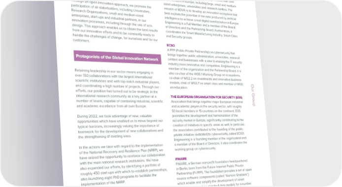 ESG / Sustainability Report / 2022 ESG / Sustainability Report / 2022 Our main certificationsin the main research promotion initiatives at national and European level, and the construction of a solid network ISO 14001: 2015 - Environmental Management System EII, Municipia, D.HUB, Nexen, Webresults, Liveboxof collaborations and partnerships with more than 150 BIG DATA VALUE ASSOCIATION (BDVA) ISO 14064-1: 2018 UNI EN ISO 14064-1: 2019 - Greenhouse Gas EII, D.HUB, Municipia, Nexen, WebResults, Cybertech,LiveboxUniversities and research institutions in Europe and International non-profit, industry-led organization with over SA 8000: - Ethics and Human rights EII, Cybertech, Municipia, D.HUB worldwide. 200 members in Europe, including large, small and medium- ISO 26000 - UNI/PdR 18 - Social Responsibility EII, Cybertech, Municipia, D.HUB sized enterprises, universities and research centers. The ISO 45001: 2018 - Health and Safety EII, Cybertech, Municipia, D.HUB, Nexen, WebresultsThrough an open innovation approach, we promote the mission of BDVA is to develop an innovation ecosystem that ISO 37001: 2016 - Anti-Corruption EII, Municipia, D.HUB participation of all stakeholders, including Universities, best exploits the potential of the data produced by artificial UNI EN ISO 9001: 2015 - Quality EII, Cybertech, Municipia, D.HUB, Nexen, Webresults, LiveboxResearch Organizations, small and medium-sized intelligence to achieve a real digital transformation in Europe. ISO 22301: 2019 - Operational continuity EII, Cybertech, Municipia, D.HUBenterprises, start-ups and industrial partners, in our Engineering is a Full Member and a member of the Board ISO/IEC 27001: 2013 - IT security EII, Cybertech, Municipia, D.HUB, Liveboxinnovation processes, including through the use of eco-of Directors and the Partnership Board. Furthermore, it ISO/IEC 20000-1: 2018 - IT Service management EII, Cybertech, D.HUB, Liveboxdesign. This approach enables us to obtain the best results coordinates the Smart Manufacturing Industry, Smart Cities ISO/IEC 27018: 2019 - Protection of personal data in Public from our innovative efforts and to be constantly ready to and Security groups. Cloud Services EII, Municipiahandle the challenges of change, for ourselves and for our ISO/IEC 27017: 2015 - Information Security in Cloud customers. ECSO Services EII, Municipia A PPP (Public-Private Partnership) on cybersecurity that brings together public administration, universities, research Protagonists of the Global Innovation Network centers and businesses with a view to making the IT security industry more innovative and competitive. Engineering is a In managing relationships with stakeholders, the focus on Furthermore, the overall results of Customer Satisfaction member of the organization and the Partnership Board. It is Customers is particularly important. In order to measure Survey activities are shared with the company’s top Retaining leadership in our sector means engaging in also co-chair of the WG6.1 Working Group on ecosystems, and analyze the perception of their satisfaction, annual management through the transmission of reporting over 150 collaborations with the largest international co-chair of WG2.2 on investments and innovative business Customer Satisfaction Surveys are planned and carried which contains both statistical analyses and details scientific institutions and with top-notch industrial players, models, chair of WG3.7 on smart cities and member of WG5 Our Group out across major customers of the Group companies. on assessments that concern relevant aspects for the and coordinating a high number of projects. Through our on education. The approach adopted by Engineering involves the company.efforts, our position has turned out to be strategic in the administration of direct surveys (through customer international research community as a key partner at a THE EUROPEAN ORGANISATION FOR SECURITY (EOS) Our Groupinterviews) as well as the collection of data/information number of levels, capable of combining industrial, scientific Association that brings together major European industrial during online campaigns in which Customers are invited to Innovation that generates value and academic excellence from all over Europe. and academic players in the security sector, with roughly participate. 50 local members in 15 countries on the continent. EOS During 2022, we took advantage of new, valuable promotes the development and harmonization of the In the course of 2022, a total of 168 surveys were carried GRI 2-28 opportunities which have enabled us to move beyond our security market in Europe, significantly contributing to the out, with 75 in “direct interview” format and 93 online, typical horizons, increasingly valuing the importance of creation of initiatives in specific areas as well. In particular, involving 160 Customers. For larger customers, for The innovative processes on which Engineering’s research teamwork for the development of new collaborations and the association contributed to the founding of the public- which Engineering often provides services to multiple and innovation activities are based are developed within the strengthening of existing ones.private initiative dedicated to cybersecurity, called ECSO. departments, multiple contact persons may be interviewed four areas of study, namely: “Security and Cybersecurity”, Engineering is a founding member of the organization and to cover all areas in which we operate.“Industry 4.0 and Agri-food”, “Smart Energy and Content” In the actions we take with regard to the implementation a member of the Board of Directors. It also coordinates the and “Cloud Edge and E-Health”, which in turn are of the National Recovery and Resilience Plan (NRRP), we working group on cybersecurity. The results show an excellent degree of satisfaction: divided into specialized areas. The Group’s research have seized the opportunity to reinforce our collaboration th
