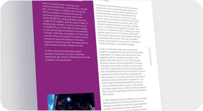 ESG / Sustainability Report / 2022 ESG / Sustainability Report / 2022 From Sustainable Procurement to asset end FOCUSED ON OUR IMPACT: THE CALCULATION Scope 2 emissions), business trips (by plane, train and center emergency generators in 2022, a higher of life OF OUR CARBON FOOTPRINTferry) and employee commuting. level of refills of refrigerant gas in 2022 and the improvement in the consumption measurement and GRI 305-1 GRI 305-2 GRI 305-3data collection process intended to fine-tune the GRI 306-1 306-2 The results precision of the data shared with stakeholders. The starting point for the implementation of a proper In 2022, Engineering’s total greenhouse gas emissions In 2022, we moved forward with our green procurement environmental impact reduction strategy is measuring the (Scope 1 + 2 + 3) amounted to 55,939 tCO . One new Lastly, as regards Scope 3 emissions, they process with a view to collaborating with suppliers that 2 company’s carbon footprint. The footprint is quantified factor in the calculation of the 2022 Carbon Footprint increased by 48,115 tCO , from 1,451 tCO to 49,566 share the principles of environmental sustainability and 2 2 on the basis of internationally recognized technical and compared to previous years is the measurement of tCO . This increase is justified by the introduction social responsibility and offer us quality products and 2 scientific criteria and standards in order to obtain an greenhouse gas emissions linked to the purchase of into the calculation of emissions linked to the services. To this end, in contracts as well as in supply objective result that can be repeated over the years. goods and services (GHG Protocol category 1) and purchase of goods and services, which alone tenders, starting from 2021 we introduced environmental those linked to fuels and energy not included in Scopes totaled 36,352 tCO2 (what particularly impacts the sustainability requirements for purchases, which today The Carbon Footprint is the main environmental indicator 1 and 2 (GHG Protocol category 3), bearing witness to weight of this category, given the specific nature of represent a weighting element in the supplier selection capable of quantifying an organization’s impact on climate Engineering’s efforts aimed at continuous improvement Engineering’s activities, is services, which amount process. Furthermore, as of September 15, 2022, a new change in terms of direct and indirect CO emissions: a in understanding its environmental impacts and, as a to 32,657 tCO out of the total), and those relating version of our “General Purchase Conditions” was made 2 2 figure which makes it possible to identify the activities result, in the direction of mitigating them. In 2021, Scope to fuels and energy (not included in the calculation available, which in Article 11.12 contain an “ESG clause” characterized by a greater “footprint” throughout the entire 1, 2 and 3 greenhouse gas emissions (which did not yet of Scope 1 and Scope 2 emissions). The final result that refers to “ethical conduct and compliance with social value chain. The following were included in the calculation consider emissions linked to categories 1 and 3, but only was also influenced by growth in emissions linked responsibility ESG principles”. Moreover, all suppliers of Engineering’s Carbon Footprint: those linked to GHG Protocol categories 6 and 7) instead to business travel and employee commuting, already surveyed will be invited to view the amendment amounted to 10,116 tCO . triggered by the fine-tuning of the analysis and an introduced through the ongoing ESG campaign. 2 - Scope 1 direct emissions from stationary combustion improvement in the data collection process.In 2021, an initial large tender was announced that Environmental (generated by the combustion of natural gas for Analyzing the results in detail, it can be seen that the heating the offices and the diesel used for Data Center Scope 2 market-based emissions were reduced by 2,466 In 2023, with the Decarbonization project assigned a very significant score to product environmental emergency generators), mobile combustion (generated tCO (-73%), from 3,400 tCO2 to 934 tCO . Engineering mentioned elsewhere, the goal of extending sustainability. This resulted in the signing of a two-year 22 by the company vehicle fleet, fueled for the most part achieved this result thanks to lower Data Center greenhouse gas emission monitoring to the foreign agreement, with the possibility of extension, for the with diesel and to a lesser extent with gasoline) and the electricity consumption (also linked to the effects of companies is being pursued. gradual replacement of the more than 12,000 existing EnvironmentalEnvironmentalsupply of refrigerant gas for the data centers;energy efficiency projects) and a larger share of energy personal computers with new laptops (95% of our future - Scope 2 indirect emissions from the consumption of coming from renewable sources. workstations) that are 91% recyclable. The contract also electricity acquired from the network and used at the calls for the supply of other types of accessory products. Group’s offices and 5 Data Centers (Pont-Saint-Martin, Scope 1 emissions on the other hand increased by One of the parameters that led to the selection of a specific Assago, Vicenza, Fiumicino and Turin);174 tCO (+3%), from 5,265 tCO to 5,439 tCO . This supplier was its publicly formalized commitment to the 222 - Scope 3 indirect emissions from activities associated growth was caused by an increase in liters of natural decarbonization of its activities, which in the medium term with the purchase of goods and services, fuels and gas consumed by the company vehicle fleet in 2022, will result in GHG emissions close or equal to zero. The energy (not included in the calculation of Scope 1 and an increase in liters of diesel consumed by the data tender assigned demonstrates Engineering’s desire to seek out a balance between 
