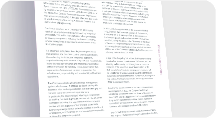 ESG / Sustainability Report / 2022 ESG / Sustainability Report / 2022 Our governance of that governance body is not a top manager of the MEMBERSHIP OF THE UN GLOBAL COMPACT Company. In 2021, Engineering joined the United Nations Global Compact, an initiative founded to encourage companies all GRI 2-9 2-10 2-11 2-12 2-13 2-14 2-15 2-16 2-17 2-18Pending the revision of corporate governance - to be over the world to adopt sustainable policies in compliance with corporate social responsibility and make public 2-19 2-20 2-23 2-24 2-25implemented following the appointment of the new the results of the actions undertaken. The companies that participate in the Global Compact have a strong sense administrative body, as its term of office is coming to an of social responsibility and aspire to sustainable global growth, which takes into account their own interests and, As of December 31, 2022, Engineering Ingegneria end with the approval of the financial statements - in 2022 through the commitment to safeguarding the environment, the expectations of future generations as well.Informatica S.p.A. was wholly owned by Centurion Bidco the Board of Directors had not yet identified and adopted S.p.A. However, on June 1, 2023, the downstream merger a policy on the independence requirements for holding the Through a Letter of Commitment to the Global Compact sent to UN Secretary General António Guterres, our Group by incorporation pursuant to Arts. 2501-bis and 2501-ter of role of Director of the Company. Therefore, no statements has formally adhered to the Ten Universal Principles relating to human rights, labor, the environment and the fight the Italian Civil Code of Centurion Bidco into Engineering attesting to compliance with such requirements were against corruption, to promote the values of sustainability in the long term, with company policies and practices, and Ingegneria Informatica S.p.A. became effective, as a result issued by the directors in office at the time in order for social and civil initiatives. This commitment was renewed in 2022 when the Group participated in the Early Adopter of which Centurion Newco S.p.A. became the new sole them to be qualified as independent. program of the CoP (Communication on Progress), whereby the Group reported on its progress made in integrating shareholder of Engineering. the ten principles of social responsibility into its business strategies. In 2023, with the appointment of the new administrative Our Group structure as of December 31, 2022 is the body, 3 female directors were appointed. Furthermore, As a member of the Italy Network of the Global Compact, Engineering also participated in 2022 in the first edition result of an acquisition strategy followed by integration 4 directors out of 13 were qualified as independent on of the Target Gender Equality (TGE). The TGE is an accelerator program which allows participating companies processes. This led to the creation of a body consisting the basis of specific independence statements that they to strengthen their contribution to the pursuit of Sustainable Development Goal 5.5, which demands equal of seventy companies, including the Parent Company, provided, taking into account the “Guidance of the Board representation, participation and leadership of women in companies all over the world. The program relies on of which sixty-five are operational while five are in the of Directors of Engineering Ingegneria Informatica S.p.A. Ethics and governance capacity building workshops, learning meetings between peers at national level, the testimonials of experts and liquidation phase. concerning the criteria of independence to hold the office facilitated performance analyses, all aimed at improving the definition of objectives and action plans that increase of Director of the Company” adopted by the Company on a the representation and leadership of women in organizations.It is important to highlight how Engineering exercises voluntary basis on June 23, 2023. management and business control over its subsidiaries, An additional confirmation of the Group’s commitment to pursuing gender equality is represented by the signing of thus reflecting its distinctive integrated approach, In light of the foregoing, it is evident that the shareholders’ the WEPs (Women’s Empowerment Principles) in October 2022. A joint UN Global Compact and UN Women initiative organized into specific centers of operational responsibility. meeting has focused in particular on ESG issues, such as which in 7 principles offers companies a guide on how to promote gender equality and women’s empowerment in In the increasingly dynamic and interconnected context diversity and inclusivity, considering them to be central Ethics and governanceEthics and governancethe workplace.of the Information Technology sector, governance thus elements in the process of appointing members of the represents a fundamental element to guarantee the BoD as well, for which in the coming years measures will The Seven principles of women’s empowermenteffectiveness, responsibility and sustainability of business be established to broaden knowledge and experience on 1. Establish high-level corporate leadership for gender equality.operations. sustainable development themes. Furthermore, starting from 2. Treat all women and men fairly at work – respect and support human rights and nondiscrimination.this edition, the BoD is responsible for the approval of the 3. Ensure the health, safety and well-being of all women and men workers.The Company adopts a traditional-type management 2022 Sustainability Report. 4. Promote education, training and professional development for women.system which makes it possible to clearly distinguish 5. Implement enterprise development, supply chain and marketing practices that empower women.between roles and responsibilities to ensure integrity and Pending the implementation of the corporate governance 6. Promote equality through community ini