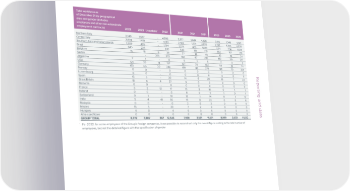 ESG / Sustainability Report / 2022 ESG / Sustainability Report / 2022 Perfomance tables PERSONNEL DATA GRI 2-7 2-8 401-1 405-1 Number of employees by Total workforce as contract type and gender MEN WOMEN TOTAL MEN WOMEN TOTAL MEN WOMEN TOTAL of December 31 by geographical as of December 31 2022 2022 2022 2021 2021 2021 2020 2020 2020 area and gender (includes employees and other non-subordinate Unavailable* 2022 2021 2021 2021 2020 2020 2020 ITALY employment contracts) 2022 2022 Open-ended contract 7,334 3,440 10,774 6,829 3,175 10,004 7,056 3,184 10,240 Fixed-term contract 18 11 29 26 14 40 45 24 69Northern Italy 3,149 1,547 - 4,696 2,877 1,449 4,326 3,195 1,548 4,743 Italy total 7,352 3,451 10,803 6,855 3,189 10,044 7,101 3,208 10,309 Central Italy 2,894 1,419 - 4,313 2,704 1,331 4,035 2,732 1,306 4,038 Southern Italy and Italian Islands 1,309 485 - 1,794 1,274 409 1,683 1,174 354 1,528 ABROAD Brazil 645 225 - 870 540 181 721 552 167 719 Open-ended contract 1,014 354 1,368 1,115 372 1,487 948 313 1,261Belgium 15 18 6 39 27 18 45 10 14 24 Fixed-term contract 6 2 8 20 20 40 50 12 62 Serbia - - 273 273 160 67 227 162 55 217 Unavailable* - - 367 - - - - - -Argentina 7 1 - 8 5 1 6 2 0 2 Abroad total 1,020 356 1,743 1,135 392 1,527 998 325 1,323USA 121 25 11 157 127 25 152 64 10 74 GRAND TOTAL 8,372 3,807 12,546 7,990 3,581 11,571 8,099 3,533 11,632Germany 163 65 20 248 199 80 279 181 70 251 Norway 0 0 - 0 0 0 0 0 0 0 * Reporting and data For 2022, for some employees of the Group’s foreign companies, it was possible to reconstruct only the overall figure relating to the total number of Luxembourg 0 0 - 0 0 0 0 0 0 0 employees, but not the detailed figure with the specification of gender and the contract typeSpain 15 5 - 20 14 6 20 15 7 22 Great Britain 18 5 4 27 5 0 5 0 0 0 Romania 0 0 - 0 0 0 0 0 0 0 France 3 2 12 17 15 3 18 0 1 1 Ireland 0 0 - 0 0 0 0 1 0 1 Disclosure on other employees - Unit ofSwitzerland 9 1 - 10 13 1 14 11 1 12 Italy measurement 2022 2021 2020 India 5 4 41 50 15 8 23 0 0 0 Lavoratori al 31 dicembre Malaysia 0 0 - 0 2 0 2 0 0 0 Total number of interns n. 116 195 113Mexico 15 5 - 20 7 2 9 0 0 0 Total number of temporary workers n. 228 192 210Hungary 4 0 - 4 6 0 6 0 0 0 Other Altro specificare 0 0 . 0 0 0 0 0 0 0 Reporting and dataSeconded from other associated company n. 644 461 407GROUP TOTAL 8,372 3,807 367 12,546 7,990 3,581 11,571 8,099 3,533 11,632 TOTAL n. 988 848 730 * For 2022, for some employees of the Group’s foreign companies, it was possible to reconstruct only the overall figure relating to the total number of employees, but not the detailed figure with the specification of gender 96 Engineering © Engineering © 97