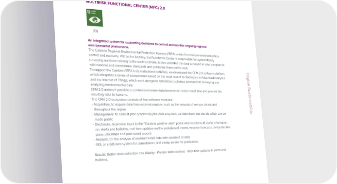 ESG / Sustainability Report / 2022 ESG / Sustainability Report / 2022 ANITA: TECHNOLOGIES FOR MONITORING ILLEGAL TRAFFICKINGMULTIRISK FUNCTIONAL CENTER (MFC) 2.0 (16) (13) New technologies can provide significant support to investigations into illegal trafficking. An integrated system for supporting decisions to control and monitor ongoing regional The aim of the European ANITA project coordinated by Engineering is to create and implement environmental phenomena. automated tools for monitoring the trafficking of drugs, counterfeit medicines, new psychoactive The Calabria Regional Environmental Protection Agency (ARPA) works for environmental protection, substances (NPS) and weapons linked to terrorism.control and recovery. Within the Agency, the Functional Center is responsible for systematically The project calls for the development of a platform to support investigations into illegal activities, surveying numbers relating to the earth’s climate. It also validates the data surveyed in strict compliance which is able to identify and analyze different online data sources (text, audio, video, image) to provide with national and international standards and publishes them on the web. pertinent resources to investigators.To support the Calabria ARPA in its institutional activities, we developed the CFM 2.0 software platform, Digital Sustainability These results are achieved through a combination of innovative technologies, which make it possible to which integrates a series of components based on the most recent technologies in Advanced Analytics carry out a number of activities:and the Internet of Things, which work alongside specialized activities and services surveying and • analysis of cryptocurrency networks and financial transactionsanalyzing environmental data. • the combination and automated processing of data and informationCFM 2.0 makes it possible to control environmental phenomena trends in real time and prevent the • user friendly data intelligence software, allowing users to identify spatial, temporal and causal resulting risks to humans. correlations between events, entities and illegal traffic activitiesThe CFM 2.0 ecosystem consists of five software modules: - Acquisition, to acquire data from external sources, such as the network of sensors distributed Results: Automatic analysis of large quantities of different types of content - Support for decision-throughout the region Digital Sustainabilitymaking processes - User friendly platform.- Management, to consult (also graphically) the data acquired, validate them and decide which can be made public - Disclosure, to provide input to the “Calabria weather alert” portal which collects all useful information on: alerts and bulletins, real-time updates on the evolution of events, weather forecasts, civil protection plans, risk maps and post-event reports - Analysis, for the analysis of environmental data with standard models - GIS, or a GIS web system for consultation, and a map server for publication. Results: Better data collection and display - Precise data analysis - Real-time updates in alerts and bulletins. 88 Engineering © Engineering © 89