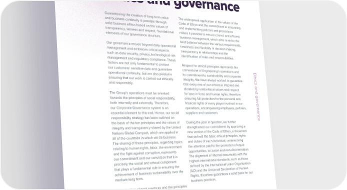 ESG / Sustainability Report / 2022 Ethics and governance Guaranteeing the creation of long-term value The widespread application of the values of the and business continuity is possible through Code of Ethics and the commitment to innovating GOVERNANCE solid business ethics based on the values of and implementing policies and procedures transparency, fairness and respect, foundational makes it possible to ensure correct and efficient elements of our governance structure. business management, which aims to strike the best balance between the various requirements, Our governance moves beyond daily operational timeliness and flexibility in decision-making, management and embraces critical aspects transparency in relationships and the such as data security, privacy, technological risk identification of roles and responsibilities. management and regulatory compliance. These factors are not only fundamental to protect Respect for ethical principles represents the our customers’ sensitive data and guarantee cornerstone of Engineering’s operations and Ethics and governance operational continuity, but are also pivotal in its commitment to sustainability and corporate ensuring that our work is carried out ethically integrity. We have always worked to guarantee and responsibly. that every one of our actions is inspired and dictated by solid ethical values and respect The Group’s operations must be oriented for laws in force and human rights, therefore towards the principles of social responsibility, ensuring full protection for the personal and both internally and externally. Therefore, financial rights of every player involved in our our Corporate Governance system is an operations, encompassing employees, partners, essential element to this end. Hence, our social suppliers and customers. responsibility strategy has been outlined on the basis of the ten principles and the values of During the year in question, we further integrity and transparency shared by the United strengthened our commitment by approving a Nations Global Compact, which are applied in new version of the Code of Ethics, a document all of the countries in which we do business. that defines the basic ethical principles, rights The sharing of these principles, regarding topics and duties of each individual, underscoring relating to human rights, labor, the environment the attention paid to the promotion of equal and the fight against corruption, represents opportunities, inclusion and non-discrimination. our commitment and our conviction that it is The alignment of internal documents with the precisely the social and ethical component highest international standards, such as those that plays a fundamental role in ensuring the defined by the International Labor Organization achievement of business sustainability over the (ILO) and the Universal Declaration of Human medium-long term. Rights, therefore guarantees a solid basis for our business practices. The adoption of best practices and the principles of responsibility and transparency with respect to stakeholders makes our governance structure robust ad capable of harmonizing economic, social and environmental objectives together, as well as guaranteeing high standards of quality and reliability, elements of strength which distinguish our corporate identity. Engineering © 59