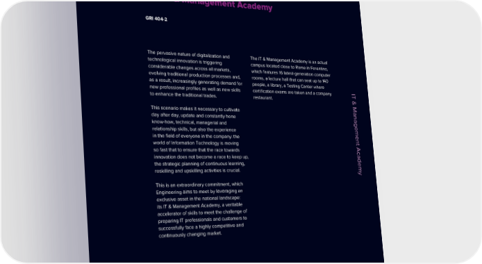 ESG / Sustainability Report / 2022 Our IT & Management Academy GRI 404-2 KNOWLEDGE, KNOWHOW, KNOWING HOW TO BE The pervasive nature of digitalization and The IT & Management Academy is an actual technological innovation is triggering campus located close to Rome in Ferentino, Our IT & Management considerable changes across all markets, which features 16 latest-generation computer evolving traditional production processes and, rooms, a lecture hall that can seat up to 140 as a result, increasingly generating demand for people, a library, a Testing Center where Academy new professional profiles as well as new skills certification exams are taken and a company IT & Management Academy to enhance the traditional trades. restaurant. This scenario makes it necessary to cultivate day after day, update and constantly hone know-how, technical, managerial and relationship skills, but also the experience in the field of everyone in the company: the world of Information Technology is moving so fast that to ensure that the race towards innovation does not become a race to keep up, the strategic planning of continuous learning, reskilling and upskilling activities is crucial. This is an extraordinary commitment, which Engineering aims to meet by leveraging an exclusive asset in the national landscape: its IT & Management Academy, a veritable accelerator of skills to meet the challenge of preparing IT professionals and customers to successfully face a highly competitive and continuously changing market. Engineering © 45