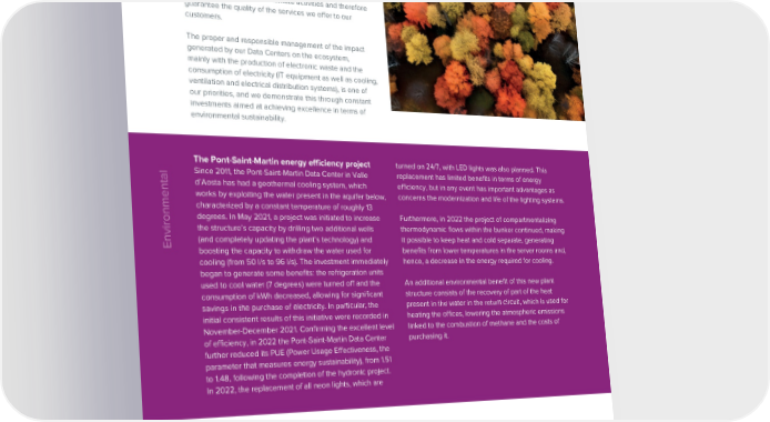 ESG / Sustainability Report / 2022 ESG / Sustainability Report / 2022 Green Data Center, energy sustainability Particularly with regard to the Vicenza Data Center, in the models course of 2022 the process was initiated of recertifying compliance with the ANSI/TIA-942-B standard, which takes Our Data Centers guarantee the management of the IT place every three years. technological infrastructure on which all of the Group’s Italian offices rely for their remote activities and therefore The objective consists of certifying the Data Center guarantee the quality of the services we offer to our at Rating 4 in all four areas considered by the Our car fleet: more hybrid and more electric customers. standard: mechanical, electrical, physical security and telecommunications. In December 2022, the company fleet had 1,736 vehicles, The proper and responsible management of the impact of which 334 hybrid/electric purchased under long-term generated by our Data Centers on the ecosystem, In addition, in 2022 the optimization of thermodynamic rental (LTR) agreements. In 2021, the policy relating to the mainly with the production of electronic waste and the flows in the DPC rooms of the Data Center was concluded, use and type of vehicles available (car list) was updated. consumption of electricity (IT equipment as well as cooling, with the physical compartmentalization of the cold and hot After electric vehicles were introduced, charging stations ventilation and electrical distribution systems), is one of corridors. were installed at our main offices. our priorities, and we demonstrate this through constant investments aimed at achieving excellence in terms of Therefore, in 2022 excellent environmental performance In 2022, in the wake of the new policy issued in 2021, environmental sustainability. was recorded by the Vicenza Data Center, which already we ordered 377 hybrid vehicles which, given the current in 2017 had obtained the TIER IV certification from the market situation, will be delivered in the course of 2023- Uptime Institute, for the initial design phase and for the final 2024. implementation and on-site post-verification phase. turned on 24/7, with LED lights was also planned. This With redundancy at the level of electrical circuits, cooling On the path towards electrifying the company fleet, The Pont-Saint-Martin energy efficiency project Since 2011, the Pont-Saint-Martin Data Center in Valle replacement has limited benefits in terms of energy and network, the Data Center is able to maintain a high Engineering’s priority objective is to install charging Environmental d’Aosta has had a geothermal cooling system, which efficiency, but in any event has important advantages as level of energy efficiency (PUE of 1.82 in 2022) and, at stations at the offices. Furthermore, incentives are offered works by exploiting the water present in the aquifer below, concerns the modernization and life of the lighting systems. the same time, significant system reliability, thanks to low to encourage employees to adopt electric, plug-in or full characterized by a constant temperature of roughly 13 environmental impact solutions and structural adaptations, electric vehicles, such as charging cards that can be used degrees. In May 2021, a project was initiated to increase Furthermore, in 2022 the project of compartmentalizing such as separation from the outside environment through to charge the vehicle even at third-party charging stations, the structure’s capacity by drilling two additional wells thermodynamic flows within the bunker continued, making insulating corridors. This architecture makes it possible to and fringe benefit subsidies. The charging stations at the Environmental(and completely updating the plant’s technology) and it possible to keep heat and cold separate, generating identify and isolate any possible damage to the center’s company’s offices will also be updated and new ones will boosting the capacity to withdraw the water used for benefits from lower temperatures in the server rooms and, systems, while also supporting and maintaining active all be introduced. cooling (from 50 l/s to 96 l/s). The investment immediately hence, a decrease in the energy required for cooling. IT loads and the business critical systems of the customers began to generate some benefits: the refrigeration units hosted at that location. used to cool water (7 degrees) were turned off and the An additional environmental benefit of this new plant consumption of kWh decreased, allowing for significant structure consists of the recovery of part of the heat Furthermore, for this Data Center the study was concluded savings in the purchase of electricity. In particular, the present in the water in the return circuit, which is used for for the replacement of the air-water refrigeration units initial consistent results of this initiative were recorded in heating the offices, lowering the atmospheric emissions with a new high efficiency free cooling system that will November-December 2021. Confirming the excellent level linked to the combustion of methane and the costs of make it possible to fully eliminate water consumption and of efficiency, in 2022 the Pont-Saint-Martin Data Center purchasing it. significantly reduce electricity consumption compared to further reduced its PUE (Power Usage Effectiveness, the the current water-water systems. The replacement work will parameter that measures energy sustainability), from 1.51 be completed by the end of December 2023. to 1.48, following the completion of the hydronic project. In 2022, the replacement of all neon lights, which are The ANSI/TIA-942-B Rating 4 certification was successfully obtained in July 2023, was published on the website of the certifying body and will be valid for three years until 2026. This makes the Data Center certified with the highest In April 2022, activities at the Assago Data Center were degree of reliability on the basis of ANSI/TIA-942B as