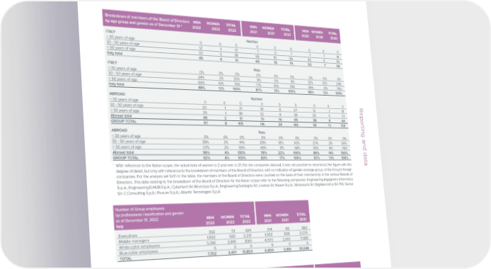 ESG / Sustainability Report / 2022 ESG / Sustainability Report / 2022 Breakdown of employees by age Breakdown of members of the Board of Directors MEN WOMEN TOTAL MEN WOMEN TOTAL MEN WOMEN TOTAL group, gender and geographical MEN WOMEN TOTAL MEN WOMEN TOTAL MEN WOMEN TOTALby age group and gender as of December 31 * 2022 2022 2022 2021 2021 2021 2020 2020 2020 area as of December 31 2022 2022 2022 2021 2021 2021 2020 2020 2020 ITALY Number ITALY < 30 years of age 0 0 0 0 0 0 0 0 0 < 30 years of age 1,169 473 1,642 872 360 1,232 864 350 1,21430 - 50 years of age 12 1 13 7 0 7 7 7 14 30 - 50 years of age 3,696 1,865 5,561 3,713 1,845 5,558 4,099 1,990 6,089> 50 years of age 33 5 38 58 10 68 45 0 45 > 50 years of age 2,487 1,113 3,600 2,270 984 3,254 2,138 868 3,006Italy total 45 6 51 65 10 75 52 7 59 Italy total 7,352 3,451 10,803 6,855 3,189 10,044 7,101 3,208 10,309 ITALY Rate ABROAD < 30 years of age 0% 0% 0% 0% 0% 0% 0% 0% 0% < 30 years of age 246 80 326 331 125 456 275 97 37230 - 50 years of age 24% 2% 25% 9% 0% 9% 12% 12% 24% 30 - 50 years of age 453 192 645 703 238 941 660 207 867> 50 years of age 65% 10% 75% 77% 13% 91% 76% 0% 76% * Per il 2022 per alcuni dipendenti delle società estere del Gruppo è stato possibile ricostruire solo il dato complessivo relativo al numero totale di dipendenti, Italy total 88% 12% 100% 87% 13% 100% 88% 12% 100% > 50 years of age 129 32 161 101 29 130 63 21 84 ma non il dato di dettaglio con la specifica del genere e della fascia di età di appartenenza. Unavailable* - - 611 - - - - - -ABROAD Number Abroad total 828 304 1,743 1,135 392 1,527 998 325 1,323 Grand Total 8,180 3,755 12,546 7,990 3,581 11,571 8,099 3,533 11,632< 30 years of age 0 0 0 0 0 0 0 0 0 Reporting and data 30 - 50 years of age 20 1 21 19 8 27 12 1 13 * > 50 years of age 29 1 38 32 6 38 26 5 31 For 2022, for some employees of the Group’s foreign companies, it was possible to reconstruct only the overall figure relating to the total number of employees, but not the detailed figure with the specification of gender and age group.Abroad total 49 2 51 51 14 65 38 6 44 GROUP TOTAL 97 8 105 116 24 140 90 13 103 ABROAD Rate Number of personnel belonging MEN WOMEN TOTAL MEN WOMEN TOTAL MEN WOMEN TOTAL< 30 years of age 0% 0% 0% 0% 0% 0% 0% 0% 0% to protected categories as of December 31 2022 2022 2022 2021 2021 2021 2020 2020 2020 30 - 50 years of age 39% 2% 41% 29% 12% 42% 27% 2% 30% > 50 years of age 57% 2% 59% 49% 9% 58% 59% 11% 70% ITALY 300 225 525 304 211 515 313 209 522Abroad total 96% 4% 100% 78% 22% 100% 86% 14% 100% ABROAD* / / / / / / / / /GROUP TOTAL 92% 8% 100% 83% 17% 100% 87% 13% 100% * Reporting and data Number of personnel by type MEN WOMEN TOTAL MEN WOMEN TOTAL MEN WOMEN TOTAL With reference to the Italian scope, the actual total of women is 2 and men is 37. For the companies Abroad, it was not possible to reconstruct the figure with this of employment as of December 31 (Group) 2022 2022 2022 2021 2021 2021 2020 2020 2020 degree of detail, but only with reference to the breakdown of members of the Board of Directors, with an indication of gender and age group, of the Group’s foreign companies. For the analysis set forth in the table, the members of the Board of Directors were counted on the basis of their membership in the various Boards of Full Time 8,273 3,312 11,585 7,913 3,073 10,986 8,029 2,983 11,012Directors. The data relating to the breakdown of the Board of Directors for the Italian scope refer to the following companies: Engineering Ingegneria Informatica Part Time 86 492 578 77 508 585 70 550 620S.p.A.; Engineering D.HUB S.p.A.; Cybertech Srl; Municipia S.p.A.; Engineering Sardegna Srl; Livebox Srl; Nexen S.p.A.; Webresults Srl; Digitelematica Srl; FDL Servizi Unavailable** - - 383 - - - - - -Srl; C.Consulting S.p.A.; Plusure S.p.A.; Atlantic Tecnologies S.p.A. TOTAL 8,359 3,804 12,546 7,990 3,581 11,571 8,099 3,533 11,632 Number of personnel by type MEN WOMEN TOTAL MEN WOMEN TOTALNumber of Group employees of employment as of December 31 (Italy) 2022 2022 2022 2021 2021 2021 by professional classification and gender Full Time 7,279 2,988 10,267 6,783 2,689 9,472as of December 31, 2022 MEN WOMEN TOTAL MEN WOMEN TOTAL Part Time 73 463 536 72 500 572Italy 2022 2022 2022 2021 2021 2021 TOTAL 7,352 3,451 10,803 6,855 3,189 10,044 Executives 352 72 424 314 66 380 Middle managers 1,652 560 2,212 1,562 508 2,070 * White-collar employees 5,342 2,819 8,161 4,973 2,615 7,588 The figure relating to employees belonging to protected categories in the Engineering companies abroad is unavailable ** Blue-collar employees 6 0 6 6 0 6 For 2022, for some employees of the Group’s foreign companies, it was possible to reconstruct only the overall figure relating to the total number of employees, but not the detailed figure with the specification of gender and type of employment TOTAL 7,352 3,451 10,803 6,855 3,189 10,044 Number of Group employees by professional classification and gender as of December 31, 2022 MEN WOMEN TOTAL MEN WOMEN TOTAL MEN WOMEN TOTAL Group 2022 2022 2022 2021 2021 2021 2020 2020 2020 Executives 371 74 445 325 69 394 330 62 392 Middle managers 1,748 588 2,336 1,588 520 2,108 1,542 492 2,034 White-collar employees 6,055 3,093 9,148 6,071 2,992 9,063 6,227 2,979 9,206 Blue-collar employees 6 0 6 6 0 6 0 0 0 Unavailable* - - 611 - - - - - - TOTAL 8,180 3,755 12,546 7,990 3,581 11,571 8,099 3,533 11,632 * For 2022, for some employees of the Group’s foreign companies, it was possible to reconstruct only the overall figure relating to the total number of employees, but not the detailed figure with the specification of gender and professional classification 98 Engineering © Engineering © 99