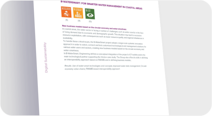 ESG / Sustainability Report / 2022 ESG / Sustainability Report / 2022 BWATERSMART: FOR SMARTER WATER MANAGEMENT IN COASTAL AREAS VIVI AIBIBANK (9) (11) (13) (3) (9) New business models based on the circular economy and water-smartness Predictive diagnoses and precision medicine In coastal areas, the water sector is facing a number of challenges, such as water scarcity in the face In OECD area countries, cancer is the second cause of death. More than 1,000 new cases are of rising demand due to economic and demographic growth. This situation may lead to excessive diagnosed in Italy every day. resource exploitation, with consequences such as lower resource quality and regional imbalances in Early diagnosis, or the identification of the disease before it emerges, is crucial. It is also necessary availability. to move beyond one-size-fits-all screening, in which everyone takes the same exam starting from the To handle these critical issues, the B-WaterSmart project adopts a large-scale systemic innovation same age and at the same frequency, to move towards personalized screening. The AiBiBank project approach in order to select, connect and test customized technological and management solutions for fits within the context of predictive diagnostics and precision medicine, integrating bio-tech, clinical and Digital Sustainability various water users and sectors, creating new business models based on the circular economy and IT skills. In particular, the system will rely on the use of Artificial Intelligence techniques to provide two water-smartness. demonstrators in breast cancer and prostate cancer screening. In B-WaterSmart, Engineering defines a conceptual integration of the project’s ICT toolkits and is the main technological partner supporting the Venice case study. The Group also offers its skills in defining Results: Centralized tissue biobank; Data Lake and digital images; AI technologies for screening; an interoperability approach based on FIWARE and in defining business models.. Business Model for data exploitation Results: Use of water-smart technologies and concepts; Improved water data management; Circular economy value chains; FIWARE-based interoperability approach Digital Sustainability 78 Engineering © Engineering © 79