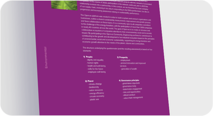 ESGESG / Sustainability R/ Sustainability Report / 2022eport / 2022 PARTNERSHIP WITH OPENES FOR THE ASSESSMENT OF SUPPLY CHAIN SUSTAINABILITY Since 2021, Engineering has collaborated with the Open-es platform, subjecting itself as a supplier to the ESG assessment and sharing its relevant projects with the network of associated companies. In the course of 2022, participation in the network continued, and in 2023 the relationship evolved into a partnership. In this context, we are therefore the lead company of our supply chain, involving it not only in responding to the ESG questionnaire, but also in progressive and increasing awareness-raising on sustainability performance. The Open-es platform was created in order to build a system and connect organizations and businesses, outline a shared sustainability measurement, improvement and growth process and favor collaboration on these topics. It is a community open to all companies committed to the challenge of the energy transition, with the participation of more than 1,600 companies in nearly 40 countries all over the world. The goal of Open-es is to create an inclusive and collaborative ecosystem of companies attentive to their environmental, social and economic impact. By participating in the Open-es Community, Engineering confirms its commitment to contributing to the growth and development of an industrial ecosystem based on the principles of environmental, social and economic sustainability, supporting an energy transition and economic growth attentive to the needs of the planet, citizens and communities. The structure underlying the questionnaire (and the resulting assessment) is based on four Environmental elements: 1) People: 3) Prosperity - dignity and equality - employment - human rights - product innovation and improved EnvironmentalEnvironmental - health and well-being services - skills for the future - generation of wealth - employee well-being 2) Planet 4) Governance principles - climate change - governance objectives - biodiversity - governance body - water resources - stakeholder engagement - energy efficiency - risks and opportunities - circular economy - ethical conduct - plastic use - value chain management. 3030303300 Engineering © Engineering © Engineering © 31 Engineering © Engineering © Engineering © Engineering ©