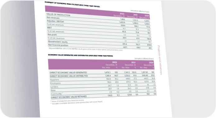 ESG / Sustainability Report / 2022 ESG / Sustainability Report / 2022 Economic value generated and distribuited HighlightsIn the course of 2022, the Group obtained a significant SUMMARY OF ECONOMIC RESULTS (2020-2022 THREE-YEAR PERIOD) (amounts in millions of euro) improvement in its profitability, in percentage as well as 2022 2021 2020 Revenues absolute terms, across all of the main indicators. December, 31 December, 31 December, 31 1,459 million euro VALUE OF PRODUCTION 1,460 1,321.3 1,241.5 The Group’s objective is definitely the creation of wealth for Net revenues 1,422.6 1,298.0 1,218.5 Economic value distributed its shareholders, employees and suppliers. The generation to stakeholders of well-being for the community and new wealth for the Adjusted EBITDA* 208.6 198.2 177.4 1,341.4 million eurocountry is no less important. As of December 31, 2022, the % of net revenues 14.7 15.3 14.6 direct economic value generated by the Group was 1,478 EBIT 45.8 70.4 90.1 Net profit million euro, of which 91% was distributed (1,341 million euro). % of net revenues 3.2 5.4 7.4 29.4 million euroThe share contributed to the State amounted to 28.7 million Net profit 29.5 47.5 190.8 euro (1.9% of the total direct economic value generated), % of net revenues 2.1 3.7 15.7 while the share distributed to the community, inclusive of Shareholders’ equity 815.4 792.7 836.8 Projects and initiatives membership fees and charitable contributions, amounted to Net financial position -447.1 -106.1 -40.1 2.5 million euro. These numbers confirm our commitment to * Adjusted EBITDA refers to the EBITDA results gross of the costs of stock options and extraordinary costs. generating well-being for the community and contributing to the country’s economy.ECONOMIC VALUE GENERATED AND DISTRIBUTED (2020-2022 THREE-YEAR PERIOD) (amounts in millions of euro) 2022 2021 2020 December, 31 December, 31 December,31 Abs. Value % Abs. Value % Abs. Value % (importi in milioni di euro) * Projects and initiativesDIRECT ECONOMIC VALUE GENERATED 1,478.3 100 1,341.0 100.0 1,261.50 100 DIRECT ECONOMIC VALUE DISTRIBUTED 1,341.4 90.7 1,220.2 91.0 1,142.40 90.6 Suppliers 564.6 38.2 499.0 37.2 440.5 34.8 Employees 719.0 48.6 674.0 50.3 637.8 50.6 Lenders 26.7 1.8 12.5 0.9 16 1.3 State 28.7 1.9 34.3 2.6 47.8 3.8 ** 2.5 0.2 0.5 0.0 0.3 0.1 Community DIRECT ECONOMIC VALUE RETAINED 136.9 9.3 120.8 9.0 119.1 9.4 (*) Value of production plus financial income. (**) Includes charitable donations and sponsorships with social impact. 56 Engineering © Engineering © 57