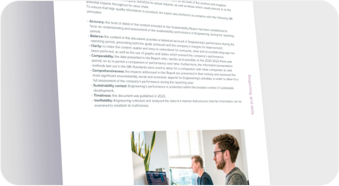 CSR / Bilancio di Sostenibilità / 2022 ESG / Sustainability Report / 2022 Reporting approach The 2022 Sustainability Report of the Engineering Group provides an account of the positive and negative impacts that concern the company, therefore its actual impacts, as well as those which could concern it, so the potential impacts throughout its value chain. To ensure that high quality information is provided, the report was drafted in accordance with the following GRI principles: - Accuracy: the level of detail of the content included in this Sustainability Report has been established to favor an understanding and assessment of the sustainability performance of Engineering during the reporting period; - Balance: the content of this document provides a balanced account of Engineering’s performance during the Reporting and data reporting period, presenting both the goals achieved and the company’s margins for improvement; - Clarity: to make the content usable and easy to understand for everyone, clear and accessible language has been preferred, as well as the use of graphs and tables which present the company’s performance; - Comparability: the data presented in the Report refer, insofar as is possible, to the 2020-2022 three-year period, so as to permit a comparison of performance over time. Furthermore, the information presentation methods laid out in the GRI Standards were used to allow for a comparison with other companies as well; - Comprehensiveness: the impacts addressed in this Report are presented in their entirety and represent the Reporting and data most significant environmental, social and economic aspects for Engineering’s activities, in order to allow for a full assessment of the company’s performance during the reporting year; - Sustainability context: Engineering’s performance is presented within the broader context of sustainable development; - Timeliness: this document was published in 2023; - Verifiability: Engineering collected and analyzed the data in a manner that ensures that the information can be examined to establish its truthfulness. Engineering © 93