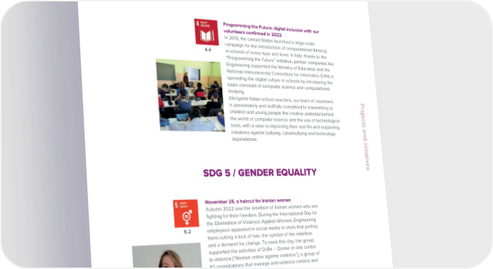 ESG / Sustainability Report / 2022 ESG / Sustainability Report / 2022 Circular migration: the Y-Med project for young Tunisians Programming the Future: digital inclusion with our and Egyptians volunteers confirmed in 2022 Five young people from Egypt, Libya and Tunisia have been In 2013, the United States launched a large-scale hired to work at our company thanks to the Y-Med project, in campaign for the introduction of computational thinking 4.110.2which Engineering was one of 26 companies selected by the 4.4 in schools of every type and level. In Italy, thanks to the Lazio Region. This is a circular migration initiative that offers “Programming the Future” initiative, partner companies like young professionals the opportunity to participate in a six-month Engineering supported the Ministry of Education and the internship at Italian companies, strengthening their skills which National Interuniversity Consortium for Informatics (CINI) in they will then be able to put to use in their country of origin. spreading the digital culture in schools by introducing the Thanks to the program promoted by the OIM, this intercultural basic concepts of computer science and computational exchange has ensured a valid path of professional growth for the thinking. workers involved as well as growth for our teams. Alongside Italian school teachers, our team of volunteers Projects and initiatives is passionately and skillfully committed to transmitting to children and young people the creative potential behind the world of computer science and the use of technological tools, with a view to improving their real life and supporting initiatives against bullying, cyberbullying and technology dependence. Our company furnishings, a circular economy project Projects and initiativesIn 2022, our offices in Assago and Pisa were transferred, but the furnishings once again went to support associations SDG 5 / GENDER EQUALITY and parishes which used them in new social projects. So, 412.5after accompanying us in our business activities, they have been given a new life in furnishing new spaces and new ideas with a circular economy approach. November 25, a haircut for Iranian women . Autumn 2022 saw the rebellion of Iranian women who are fighting for their freedom. During the International Day for the Elimination of Violence Against Women, Engineering 5.2 employees appeared in social media in shots that portray them cutting a lock of hair, the symbol of the rebellion and a demand for change. To mark this day, the group supported the activities of Di.Re – Donne in rete contro la violenza (“Women online against violence”), a group of 82 organizations that manage anti-violence centers and shelters. 52 Engineering © Engineering © 53