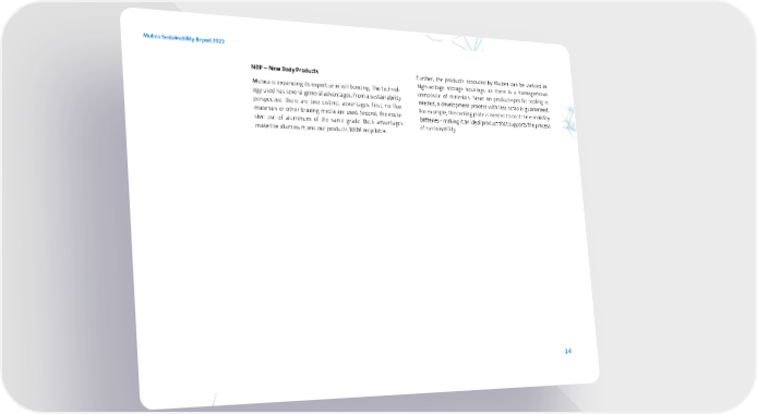 Mubea Sustainability Report 2022 NBP-New Body Products Further, the products produced by Mubea can be welded in high-voltage storage housings, as there is a homogeneous Mubea is expanding its expertise in roll bonding. The technol composite of materiais. Since no product-specific tooling is ogy used has several general advantages. From a sustainability needed, a development process with less scrap is guaranteed. perspective, there are two distinct advantages. First, no flux For example, the cooling plate is needed to cool the e-mobility materiais or other brazing media are used. Second, the exclu batteries- making it an ideal productthat supports the process sive use of aluminum of the sa爀渀e grade. Both advantages of sustai nabil ity. make the aluminum and our products 100% recyclable. 14 /