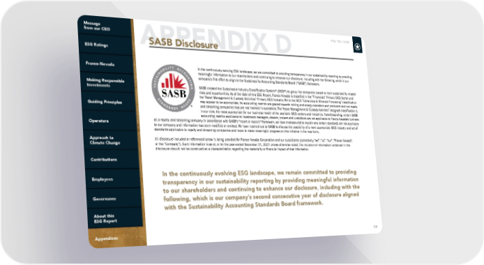 FNV: TSX | NYSE 104 APPENDIX D SASB Disclosure In the continuously evolving ESG landscape, we remain committed to providing transparency in our sustainability reporting by providing meaningful information to our shareholders and continuing to enhance our disclosure, including with the following, which is our company’s second consecutive year of disclosure aligned with the Sustainability Accounting Standards Board framework. In the continuously evolving ESG landscape, we are committed to providing transparency in our sustainability reporting by providing meaningful information to our shareholders and continuing to enhance our disclosure, including with the following, which is our company’s first effort to align to the Sustainability Accounting Standards Board (“SASB”) framework. SASB created the Sustainable Industry Classification System® (SICS®) to group like companies based on their sustainability-related risks and opportunities. As of the date of this ESG Report, Franco-Nevada is classified in the “Financials” Primary SICS Sector and the “Asset Management & Custody Activities” Primary SICS Industry. While the SICS “Extractives & Minerals Processing” classification may appear to be appropriate, its accounting metrics are geared towards mining and energy operators and producers and not royalty and streaming companies that are not involved in operations. The “Asset Management & Custody Activities” assigned classification is, in our view, the most appropriate for our business model of the available SICS sectors and industries. Notwithstanding, certain SASB accounting metrics applicable to investment managers, dealers, brokers and custodians are not applicable to Franco-Nevada’s business as a royalty and streaming company. In accordance with SASB’s “report or explain” framework, we have endeavoured to explain why certain standards are not applicable to our company and information has been modified or omitted. We have reached out to SASB to discuss the possibility of a more appropriate SICS industry and set of standards applicable to royalty and streaming companies and hope to make meaningful progress on this initiative in the near term. All disclosure included or referenced below is being provided for Franco-Nevada Corporation and our subsidiaries (collectively, “we”, “us”, “our”, “Franco-Nevada”, or the “Company”). Such information is as of, or for the year-ended December 31, 2021 unless otherwise noted. The inclusion of information contained in this disclosure should not be construed as a characterization regarding the materiality or financial impact of that information.