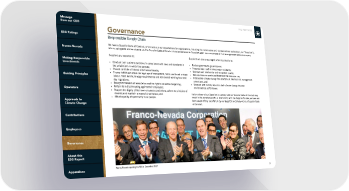 FNV: TSX | NYSE 59 Governance Responsible Supply Chain We have a Supplier Code of Conduct, which sets out our expectations for organizations, including their employees and representatives (collectively, our “Suppliers”), who supply goods and services to us. The Supplier Code of Conduct is to be delivered to Suppliers upon commencement of their arrangements with our company. Suppliers are expected to: • Conduct their business activities in compliance with laws and standards in the jurisdictions in which they operate; • Prevent conflicts of interest with Franco-Nevada; • Employ individuals above the legal age of employment, not to use forced or slave labour, meet minimum wage requirements and not exceed working hour and day regulations; • Recognize freedom of association and the right to collective bargaining; • Refrain from discriminating against their employees; • Respect the dignity of their own employees and others, adhere to principles of diversity and maintain a respectful workplace; and • Afford equality of opportunity to all people. Suppliers are also encouraged, where applicable, to: • Reduce greenhouse gas emissions; • Preserve water and minimize water pollutants; • Maintain soil, biodiversity and ecosystem quality; • Reduce resource waste and foster optimal resource use; • Incorporate climate change risk assessment into their risk management procedures; and • Measure and publicly report on their climate change risk and environmental performance. Failure of any of our Suppliers to comply with our Supplier Code of Conduct may result in the termination of our relationship with the Supplier. To date, we have not been aware of any such failure by our Suppliers to comply with our Supplier Code of Conduct. Franco-Nevada opening the TSX in December 2017