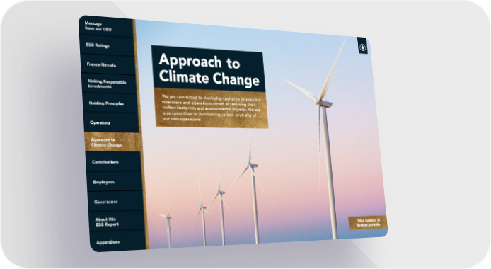 We are committed to deploying capital to responsible operators and operations aimed at reducing their carbon footprints and environmental impacts. We are also committed to maintaining carbon neutrality of our own operations Wind turbines in Western Australia