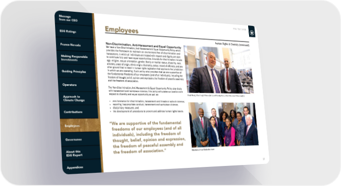 FNV: TSX | NYSE 57 Non-Discrimination, Anti-Harassment and Equal Opportunity We have a Non-Discrimination, Anti-Harassment & Equal Opportunity Policy which provides the framework to maintain an environment free of discrimination and harassment, in which all individuals are treated with respect and dignity, are able to contribute fully and have equal opportunities. Grounds for discrimination include age, religion, sexual orientation, gender, family or marital status, disability, race, ancestry, place of origin, ethnic origin, citizenship, colour, record of offences, and any other ground that is listed in human rights legislation that applies to the jurisdiction in which we are operating. Such policy also provides that we are supportive of the fundamental freedoms of our employees (and of all individuals), including the freedom of thought, belief, opinion and expression, the freedom of peaceful assembly and the freedom of association. The Non-Discrimination, Anti-Harassment & Equal Opportunity Policy also deals with harassment and workplace violence. This policy articulates our position with respect to diversity and equal opportunity as well as: • zero tolerance for discrimination, harassment and threats or acts of violence; • reporting inappropriate conduct, harassment and workplace violence; • disciplinary measures; and • the development of procedures to prevent and address human rights issues. “We are supportive of the fundamental freedoms of our employees (and of all individuals), including the freedom of thought, belief, opinion and expression, the freedom of peaceful assembly and the freedom of association.” Lloyd Hong, Chief Legal Officer (left) and Sandip Rana, Chief Financial Officer (right) Members of our Barbados team Human Rights & Diversity (continued) Employees