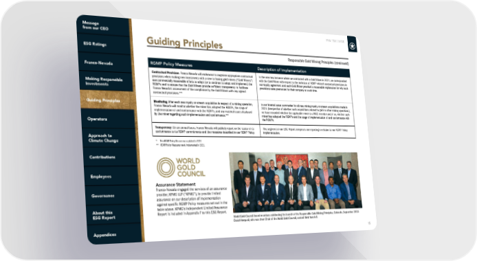 FNV: TSX | NYSE 15 Responsible Gold Mining Principles (continued) Guiding Principles RGMP Policy Measures Description of Implementation Contractual Provisions . Franco-Nevada will endeavour to negotiate appropriate contractual provisions when making new investments with a view to having gold miners (“Gold Miners”) use commercially reasonable efforts to adopt (or to continue to adopt and implement) the RGMPs and to ensure that the Gold Miners provide sufficient transparency to facilitate Franco-Nevada’s assessment of the compliance by the Gold Miners with any agreed contractual provisions.** In the one new instance where we contracted with a Gold Miner in 2021, we corresponded with the Gold Miner with respect to the inclusion of RGMP-related contractual provisions in our royalty agreement and such Gold Miner provided a reasonable explanation for why such provisions were premature for their company at such time. Monitoring . After each new royalty or stream acquisition in respect of a mining operation, Franco-Nevada will monitor whether the miner has adopted the RGMPs, the stage of implementation of and conformance with the RGMPs, and any material issues disclosed by the miner regarding such implementation and conformance.** In our internal asset summaries for all new mining royalty or stream acquisitions made in 2021 (irrespective of whether such acquisitions related to gold or other mining operations), we have recorded whether the applicable miner is a WGC member and, if so, whether such miner has adopted the RGMPs and the stage of implementation of and conformance with the RGMPs. Transparency . On an annual basis, Franco-Nevada will publicly report on the status of its conformance to its RGMP commitments and the measures described in our RGMP Policy. This segment of our ESG Report comprises our reporting in relation to our RGMP Policy implementation. * This RGMP Policy Measure was updated in 2021. ** RGMP Policy Measures newly implemented in 2021. Assurance Statement Franco-Nevada engaged the services of an assurance provider, KPMG LLP (“KPMG”), to provide limited assurance on our description of implementation against specific RGMP Policy measures set out in the table above. KPMG’s Independent Limited Assurance Report is included in Appendix F to this ESG Report. World Gold Council board members celebrating the launch of the Responsible Gold Mining Principles, Colorado, September 2019. David Harquail, who was then Chair of the World Gold Council, seated third from left.
