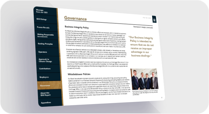 FNV: TSX | NYSE 68 Business Integrity Policy Our Board has a Business Integrity Policy for our directors, officers and employees, which is intended to supplement the Code. This Business Integrity Policy is intended to ensure that we do not receive an improper advantage in our business dealings and that all payments and expenses are properly recorded in our financial books and records. Among other things, the policy provides guidance on dealing with our agents, contractors and with public officials, acceptance of gifts, making political contributions and dealing with certain types of payments, including charitable donations and sponsorships. In accordance with our Business Integrity Policy, on an annual basis, we will publicly disclose details of political contributions or lobbying expenditures, if any, made by our company or our personnel on behalf of our company. No such contributions or expenditures have been made or incurred since our IPO. As we are not a financial institution nor a designated company under domestic or international anti-money laundering legislation (“AML Laws”), AML Laws do not apply to our company and our business. Notwithstanding, in accordance with our Business Integrity Policy, we will continue to monitor AML Laws and, to the extent that AML Laws become applicable to our company or our business, we will establish and maintain practices, procedures and policies necessary to ensure compliance with such applicable AML Laws. Our employees are obligated to promptly report any violations of the policy to our Chief Legal Officer who will in turn report to our Chief Financial Officer and our Audit and Risk Committee. Our Chief Legal Officer is also tasked with coordinating training on the substance of the Business Integrity Policy for all our personnel when appropriate and at least once annually. Whistleblower Policies Our Board has adopted employee complaint procedures for, among other things, accounting and auditing matters (contained in our Employee Complaint Procedures for Accounting and Auditing Matters) and violations of applicable laws or corporate policies (contained in our Whistleblower Policy) for our company’s directors, officers and employees to enable such personnel to submit good faith complaints relating to any such matters. The procedures outline how an employee with a good faith concern can report those concerns directly to the Chief Legal Officer, in the case of the Whistleblower Policy, or directly to the Chair of the ARC, in the case of the Employee Complaint Procedures for Accounting and Auditing Matters. In situations where such personnel prefer to place an anonymous report in confidence, they are encouraged to use the Franco-Nevada Compliance Line, hosted by a third-party hotline provider, Navex Global EthicsPoint. To date, there have been no employee complaints under either policy. “Our Business Integrity Policy is intended to ensure that we do not receive an improper advantage in our business dealings.” Governance & Integrity (continued) Governance Franco-Nevada’s Business Development team from the Toronto office (from left to right): Matt Begeman, Eaun Gray, Chris Bell and Phil Wilson