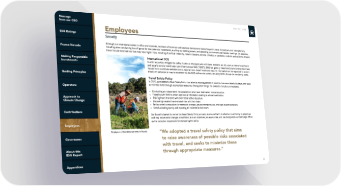 FNV: TSX | NYSE 51 Security International SOS In order to partially mitigate the safety risk to our employees who visit these locations, we rely upon an international health and security service coordinator called International SOS (“ISOS”). ISOS has globally established alarm centers which have the ability to coordinate assistance on a regional level. Expert health and security information can be requested to be sent directly to personnel or may be accessed via the ISOS self-service portals, including ISOS’s Global site monitoring portal. Travel Safety Policy In 2022, we adopted a Travel Safety Policy that aims to raise awareness of possible risks associated with travel, and seeks to minimize these through appropriate measures. Among other things, the protocols include our employees: • Conducting an independent risk assessment of a travel destination before departure • Engaging with ISOS to obtain applicable information relating to a travel destination • Sharing travel itineraries with their team before departure • Discussing elevated travel-related risks with their team • Taking certain precautions in respect of air travel, ground transportation, and hotel accommodations • Communicating openly and reporting all incidents to their team Our Board is tasked to review the Travel Safety Policy annually to ensure that it is effective in achieving its objectives and may recommend changes or additions to such objectives, as appropriate, and has designated our Chief Legal Officer as the executive responsible for overseeing the policy. “We adopted a travel safety policy that aims to raise awareness of possible risks associated with travel, and seeks to minimize these through appropriate measures.” Employees at Bald Mountain mine in Nevada Although our employees operate in office environments, members of technical and business development teams frequently travel domestically and internationally, including when conducting due diligence for new potential investments, auditing our existing assets, and attending conferences and investor meetings. On occasion, these include destinations that may have higher risks, including of political instability, natural disasters, extreme climates, or pandemic, endemic and epidemic disease. Employees