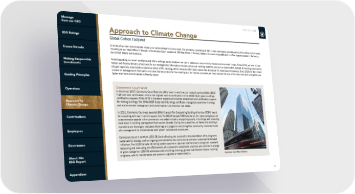 FNV: TSX | NYSE 31 Commerce Court West In December 2017, Commerce Court West (the office tower in which we are located) achieved BOMA BEST Platinum level certification. This is the highest level of certification in the BOMA BEST green buildings certification program. BOMA BEST is Canada’s largest environmental assessment and certification program for existing buildings. The BOMA BEST Sustainable Buildings certification recognizes excellence in energy and environmental management and performance in commercial real estate. In 2021, Commerce Court was awarded BOMA Canada The Outstanding Building of the Year (TOBY) Award for a building with over 1 million square feet. The BOMA Canada TOBY Awards are the most prestigious and comprehensive awards in the commercial real estate industry recognizing quality in buildings and rewarding excellence in building management from across Canada. During the competition, all facets of a building’s operations are thoroughly evaluated. Buildings are judged on everything from community involvement and site management to environmental and “green” policies and procedures. Commerce Court is certified LEED EB Gold reflecting the successful implementation of its long-term sustainability strategy and an ongoing commitment to the environment and other sustainability focused initiatives. The LEED Canada EB rating system applies a rigorous internationally-recognized standard measuring and evaluating the effectiveness of a property’s sustainable practices and policies in a range of green categories. LEED EB addresses whole building cleaning, general maintenance issues, recycling programs, exterior maintenance and systems upgrades or modernization. Approach to Climate Change Global Carbon Footprint In terms of our own environmental impact, our carbon footprint is very small. Our workforce, consisting of 36 full-time employees, operates solely within office environments, including at our head office in Toronto in Commerce Court located at 199 Bay Street in Toronto, Ontario. Our remaining staff work in office spaces located in Barbados, the United States and Australia. Notwithstanding our small workforce and office settings, we do whatever we can to reduce our carbon footprint and environmental impact. Since 2019, we have utilized Notice-and-Access delivery procedures for our management information circular and annual meeting materials sent to our shareholders. Instead of receiving paper copies of such materials, shareholders receive a notice of the meeting, which contains information about how to access the materials electronically. Since 2020, for the limited number of management information circulars that we printed for the meeting and for internal purposes, we have reduced the size of the document and arranged to use lighter and more environmentally-friendly paper. Commerce Court West in Toronto
