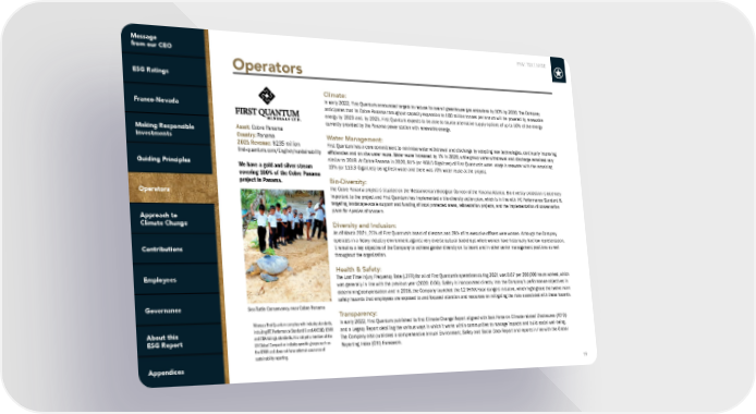 FNV: TSX | NYSE 19 Operators Climate: In early 2022, First Quantum announced targets to reduce its overall greenhouse gas emissions by 50% by 2030. The Company anticipates that its Cobre Panama throughput capacity expansion to 100 million tonnes per annum will be powered by renewable energy by 2023 and, by 2025, First Quantum expects to be able to source alternative supply options of up to 50% of the energy currently provided by the Panama power station with renewable energy. Water Management: First Quantum has a core commitment to minimise water withdrawal and discharge by adopting new technologies, continually improving efficiencies and on site water reuse. Water reuse increased by 1% in 2020, while group water withdrawal and discharge remained very similar to 2019. At Cobre Panama in 2020, 81% (or 468.5 Gigalitres) of First Quantum’s water usage is seawater with the remaining 19% (or 113.3 Gigalitres) being fresh water and there was 70% water reuse at the project. Bio-Diversity: The Cobre Panama project is situated on the Mesoamerican Biological Corridor of the Panama Atlantic. Bio-diversity protection is extremely important to the project and First Quantum has implemented a bio-diversity action plan, which is in line with IFC Performance Standard 6, targeting landscape-scale support and funding of local protected areas, reforestation projects, and the implementation of conservation plans for species of concern. Diversity and Inclusion: As of March 2021, 25% of First Quantum’s board of directors and 28% of its executive officers were women. Although the Company operates in a heavy industry environment against very diverse cultural backdrops where women have historically had low representation, it remains a key objective of the Company to achieve gender diversity on its board and in other senior management positions as well throughout the organization. Health & Safety: The Lost Time Injury Frequency Rate (LTIFR) for all of First Quantum’s operations during 2021 was 0.07 per 200,000 hours worked, which was generally in line with the previous year (2020: 0.06). Safety is incorporated directly into the Company’s performance objectives in determining compensation and in 2018, the Company launched the 12 THINK Fatal dangers initiative, which highlighted the twelve main safety hazards that employees are exposed to and focused attention and resources on mitigating the risks associated with these hazards. Transparency: In early 2022, First Quantum published its first Climate Change Report aligned with Task Force on Climate-related Disclosures (TCFD) and a Legacy Report detailing the various ways in which it works within communities to manage impacts and build social well-being. The Company also publishes a comprehensive annual Environment, Safety and Social Data Report and reports in line with the Global Reporting Index (GRI) framework. Whereas First Quantum complies with industry standards, including IFC Performance Standard 6 and ANCOLD, ICMM and CDA tailings standards, it is not yet a member of the UN Global Compact or industry-specific groups such as the ICMM and does not have external assurance of sustainability reporting. Asset: Cobre Panama Country: Panama 2021 Revenue: $235 million first-quantum.com/English/sustainability We have a gold and silver stream covering 100% of the Cobre Panama project in Panama. Sea Turtle Conservancy near Cobre Panama