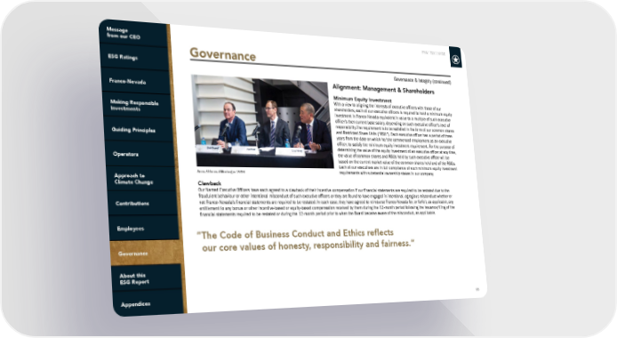 FNV: TSX | NYSE 66 Alignment: Management & Shareholders Minimum Equity Investment With a view to aligning the interests of executive officers with those of our shareholders, each of our executive officers is required to hold a minimum equity investment in Franco-Nevada equivalent in value to a multiple of such executive officer’s then current base salary, depending on such executive officer’s level of responsibility. The requirement is to be satisfied in the form of our common shares and Restricted Share Units (“RSU”). Each executive officer has a period of three years from the date on which he/she commenced employment as an executive officer, to satisfy the minimum equity investment requirement. For the purpose of determining the value of the equity investment of an executive officer at any time, the value of common shares and RSUs held by such executive officer will be based on the current market value of the common shares held and of the RSUs. Each of our executives are in full compliance of such minimum equity investment requirements with substantial ownership stakes in our company. Clawback Our Named Executive Officers have each agreed to a clawback of their incentive compensation if our financial statements are required to be restated due to the fraudulent behaviour or other intentional misconduct of such executive officers or they are found to have engaged in intentional, egregious misconduct whether or not Franco-Nevada’s financial statements are required to be restated. In each case, they have agreed to reimburse Franco-Nevada for, or forfeit, as applicable, any entitlement to any bonus or other incentive-based or equity-based compensation received by them during the 12-month period following the issuance/filing of the financial statements required to be restated or during the 12-month period prior to when the Board became aware of the misconduct, as applicable. “The Code of Business Conduct and Ethics reflects our core values of honesty, responsibility and fairness.” Governance & Integrity (continued) Governance Annual General Meeting in 2019
