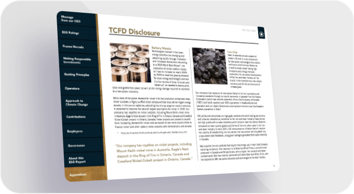 FNV: TSX | NYSE 93 TCFD Disclosure Iron Ore: Steel is essential to every aspect of modern life and is a key component for low-carbon technologies from electric vehicles to wind turbines. Known as a hard-to-abate sector having high emissions and energy-intensive production, the low-carbon development of the iron and steel industry will be crucial in the transition to a low-carbon economy and for the achievement of climate goals. Our company has exposure to low-carbon footprint iron ore operations and innovative operators through our equity ownership in Labrador Iron Ore Royalty Corporation (which has minority ownership of Iron Ore Company of Canada (“IOC”) and holds royalties over IOC’s operations in Newfoundland and Labrador) and our royalty debentures covering Vale’s Northern and Southeastern System operations in Brazil. IOC pellets and concentrate are high grade products with world leading low alumina and ultra-low phosphorus, beneficial to the iron and steel industry. These pellets are high quality with a clean chemistry, which helps to lower the carbon footprint, compared to lower quality grades and forms of iron ore, when used in the iron and steel industry. In early 2021, IOC announced an initiative that will explore the viability of transforming iron ore pellets into low-carbon hot briquetted iron, a low-carbon steel feedstock, using green hydrogen generated from hydro electricity in Canada. Vale supplies iron ore products that require less energy use in steel blast furnaces, reducing emissions. One example is its Brazilian Blend Fines, a blend of ores produced in Carajás and Minas Gerais, with a higher iron content and fewer contaminants. Vale has recently partnered with Kobe Steel and Mitsui & Co. with the objective to offer low-carbon solutions and technologies to the steel industry. Battery Metals: Technologies involved in the clean energy transition are emerging and advancing rapidly through innovation and increased deployment. According to a 2020 World Bank Report * , the production of certain battery metals will have to increase by nearly 500% by 2050 to meet the growing demand for clean energy technologies and over 3 billion tonnes of these minerals and metals will be needed to deploy wind, solar and geothermal power, as well as the energy storage required to transition to a low-carbon economy. While most of the global demand for nickel is for the production of stainless steel, nickel sulphate, a highly purified nickel compound that helps deliver higher energy density in lithium-ion batteries, extending the driving range for electric vehicles, is expected to become the second largest application for nickel in 2030. Our company has royalties on nickel projects, including Mount Keith nickel mine in Australia, Eagle’s Nest deposit in the Ring of Fire in Ontario, Canada and Crawford Nickel-Cobalt project in Ontario, Canada. These projects are poised to benefit from increasing demand for nickel and we expect to see more opportunities to finance nickel and other battery metal projects both domestically and abroad. * “Minerals for Climate Action: The Mineral Intensity of the Clean Energy Transition”, World Bank Group, 2020. “Our company has royalties on nickel projects, including Mount Keith nickel mine in Australia, Eagle’s Nest deposit in the Ring of Fire in Ontario, Canada and Crawford Nickel-Cobalt project in Ontario, Canada.”