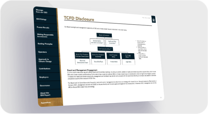 FNV: TSX | NYSE 81 TCFD Disclosure Our Board oversight and management leadership of ESG and climate-related issues is depicted in the chart below. Board and Management Engagement All of our senior executives regularly attend Board and Committee meetings, including to provide updates on royalty and stream acquisition opportunities, which include ESG and climate-related considerations. To the extent that a materially adverse ESG or climate-related issue or consideration arises during the due diligence process in respect of a royalty and stream opportunity, management and the Board may decide not to proceed with the opportunity. Recently, our company has passed on otherwise prospective opportunities because of ESG risks. The Board and its Committees also frequently meet with senior management to determine our strategy with respect to our risks and exposures. Most recently, in February 2021, management met with the CESGC to discuss diversity and inclusion goals and targets for the company and, in November 2021, management met with the ARC to discuss ESG-related risks and strategy. * Board and Committees have oversight over ESG and climate-related risks and opportunities ** Chief Executive Officer has responsibility for leadership on ESG and climate-related matters *** Chief Legal Officer has executive responsibility over ESG and climate-related matters Business Development Team Senior Vice President Business Development Diversified Team Senior Vice President Diversified Compensation and ESG Committee* Finance Team Chief Financial Officer Audit and Risk Committee* Chief Executive Officer** Board of Directors* Legal Team Chief Legal Officer***