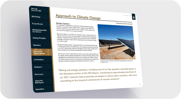 FNV: TSX | NYSE 38 Approach to Climate Change Resilient Operators Our investments in organizations, projects and initiatives developing adaptive capacity to respond to climate change to better manage climate-related risks and seize opportunities may improve our own reputation, market valuation and resilience to the transition to a low-carbon economy. Many of the assets in our portfolio are operated by best-in-class operators. The ingenuity and technical skills of these operators, including relating to sustainable practices, processes and technologies, often provide them with a competitive advantage, reducing their costs and their operating risks and ultimately reducing their cost of capital. Mining and energy operators, including most of our key operators described above in the Operators section of this ESG Report, contributing to approximately two-thirds of our 2021 revenues have proactively set targets to reduce carbon emissions, with some committing to the long-term achievement of net-zero emissions. We continue to look for opportunities to invest in other best-in-class operators and, as a capital provider, potentially facilitate their low-carbon transitions. Below we have highlighted the resourcefulness of certain of our operators, their efforts to reduce their carbon footprints, and their commitments to combating climate change, which exemplify the types of operators and operations that we look to invest in. Continental Resources’ solar panels at West Blaine recycling facility, which Franco-Nevada is helping to finance Climate Opportunities (continued) “Mining and energy operators, including most of our key operators described above in the Operators section of this ESG Report, contributing to approximately two-thirds of our 2021 revenues have proactively set targets to reduce carbon emissions, with some committing to the long-term achievement of net-zero emissions.”