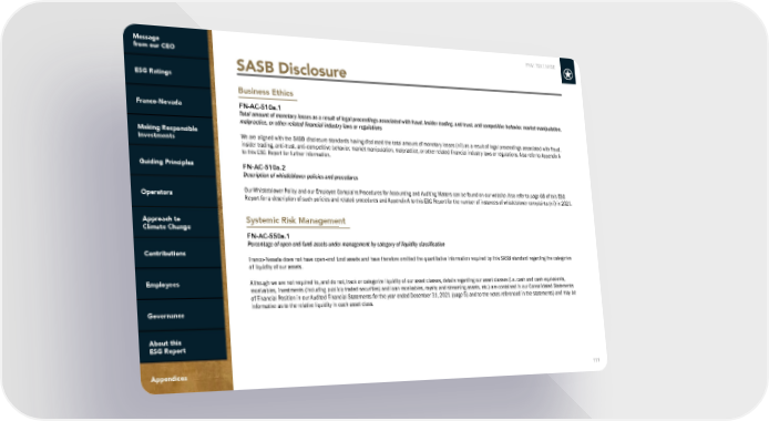 FNV: TSX | NYSE 111 SASB Disclosure Business Ethics FN-AC-510a.1 Total amount of monetary losses as a result of legal proceedings associated with fraud, insider trading, anti-trust, anti-competitive behavior, market manipulation, malpractice, or other related financial industry laws or regulations We are aligned with the SASB disclosure standards having disclosed the total amount of monetary losses (nil) as a result of legal proceedings associated with fraud, insider trading, anti-trust, anti-competitive behavior, market manipulation, malpractice, or other related financial industry laws or regulations. Also refer to Appendix A to this ESG Report for further information. FN-AC-510a.2 Description of whistleblower policies and procedures Our Whistleblower Policy and our Employee Complaint Procedures for Accounting and Auditing Matters can be found on our website. Also refer to page 68 of this ESG Report for a description of such policies and related procedures and Appendix A to this ESG Report for the number of instances of whistleblower complaints (nil) in 2021. Systemic Risk Management FN-AC-550a.1 Percentage of open-end fund assets under management by category of liquidity classification Franco-Nevada does not have open-end fund assets and have therefore omitted the quantitative information required by this SASB standard regarding the categories of liquidity of our assets. Although we are not required to, and do not, track or categorize liquidity of our asset classes, details regarding our asset classes (i.e. cash and cash equivalents, receivables, investments (including publicly traded securities) and loan receivables, royalty and streaming assets, etc.) are contained in our Consolidated Statements of Financial Position in our Audited Financial Statements for the year ended December 31, 2021 (page 5) and to the notes referenced in the statements) and may be informative as to the relative liquidity in each asset class.
